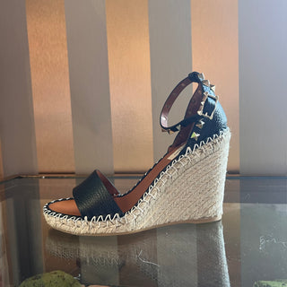 VALENTINO Black Leather Rockstud Espadrilles Wedges SZ 37 (US 7)