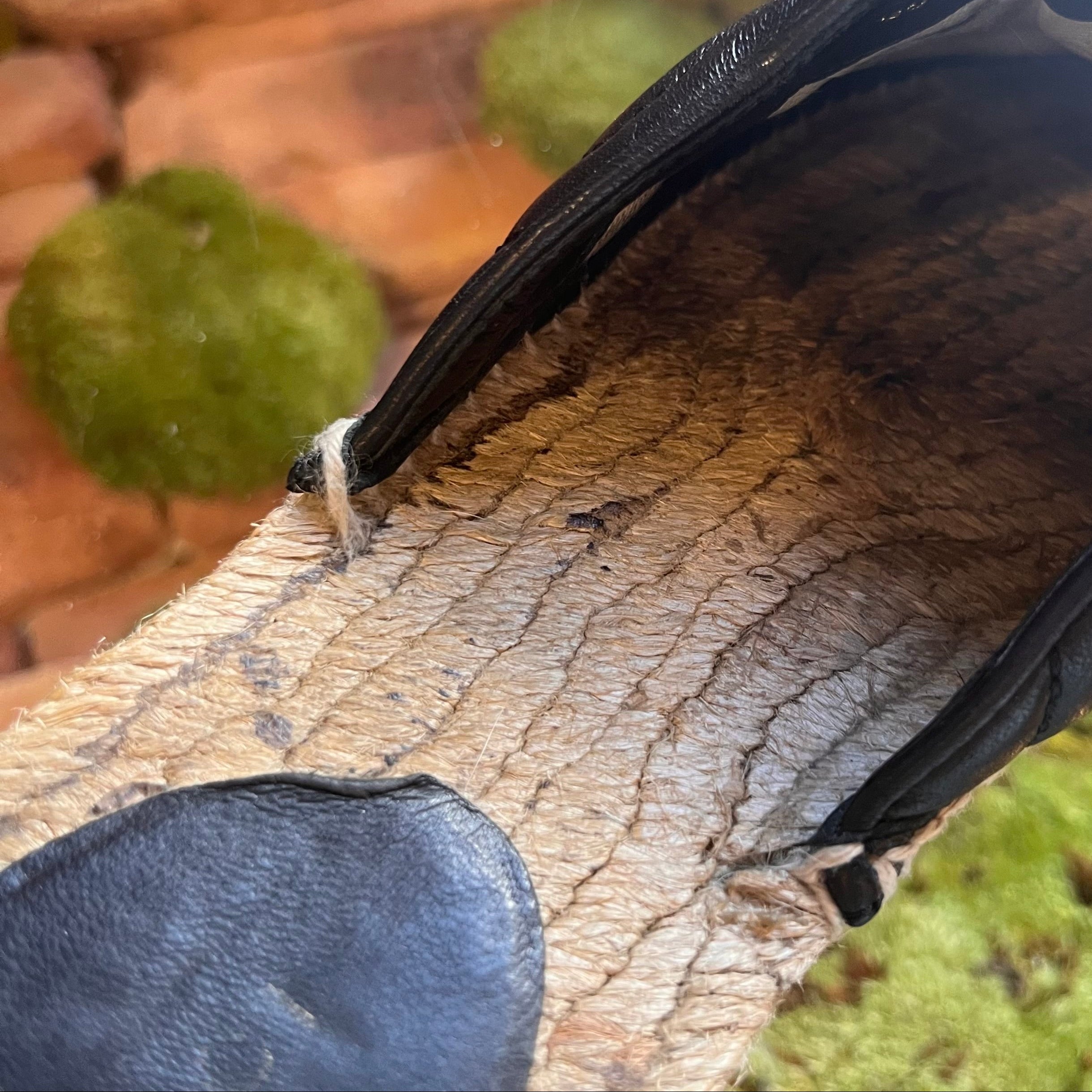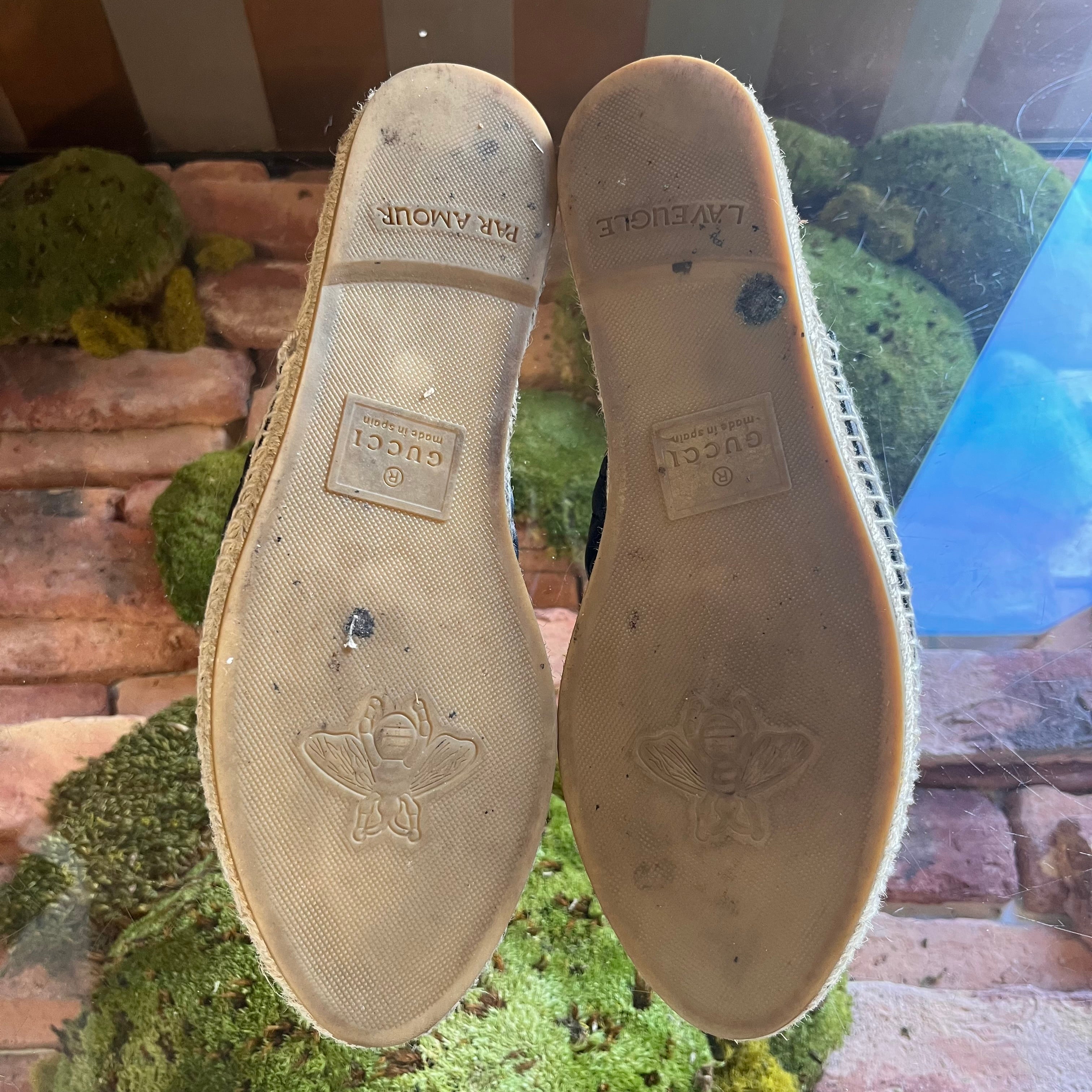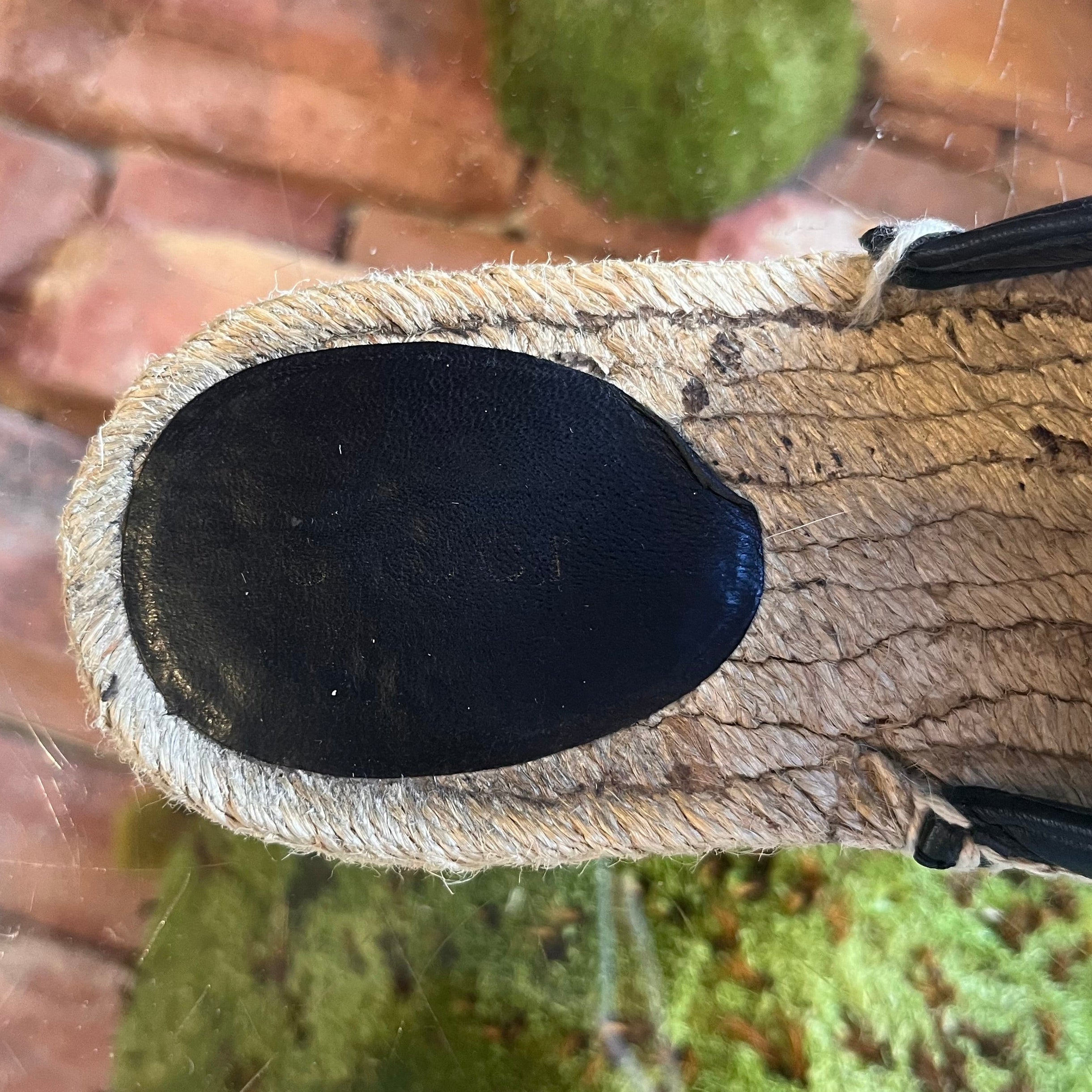 - Exterior: Soles show moderate soiling. Gentle fraying on espadrilles trim. Color is bright and vibrant. Leather is smooth and supple. Overall very good condition.