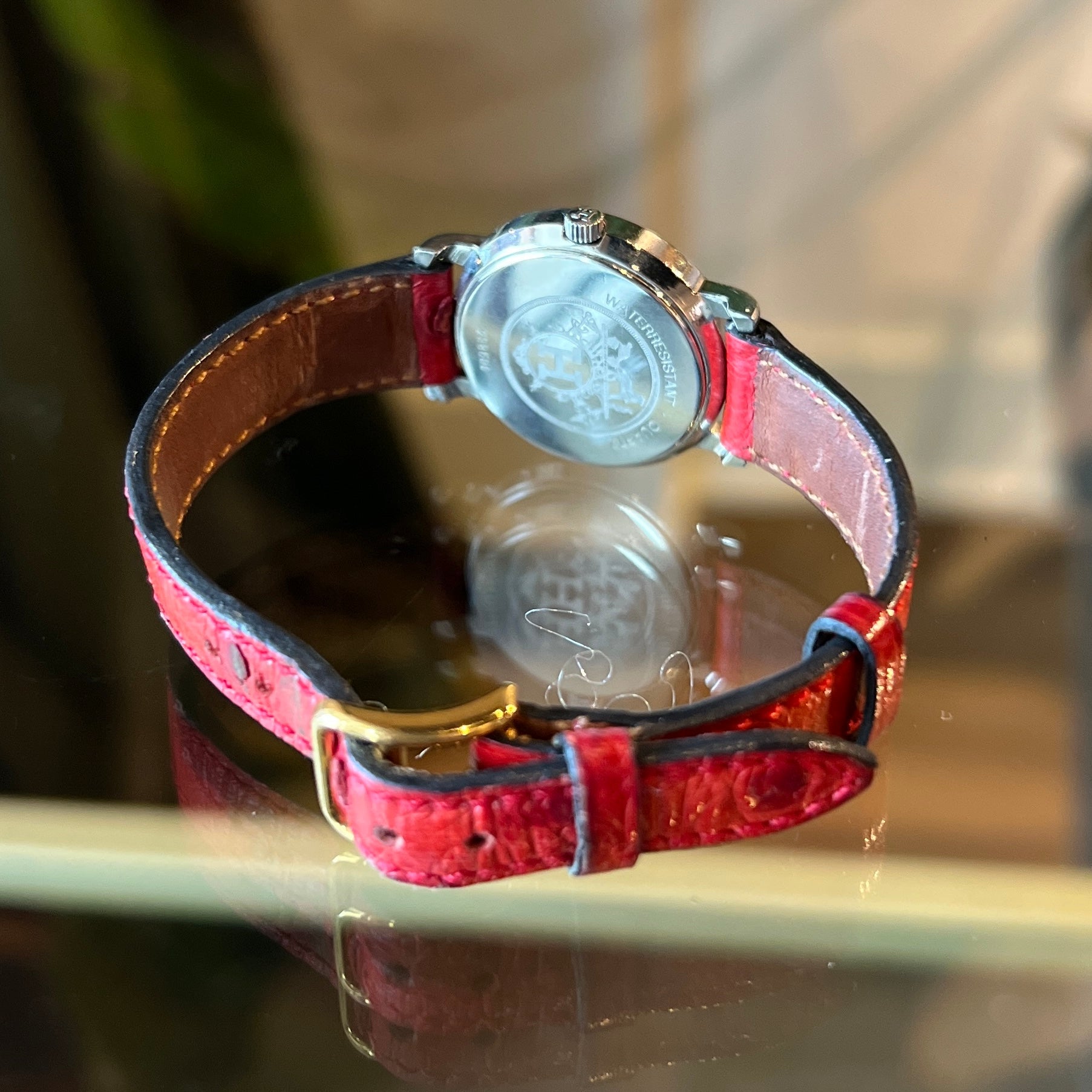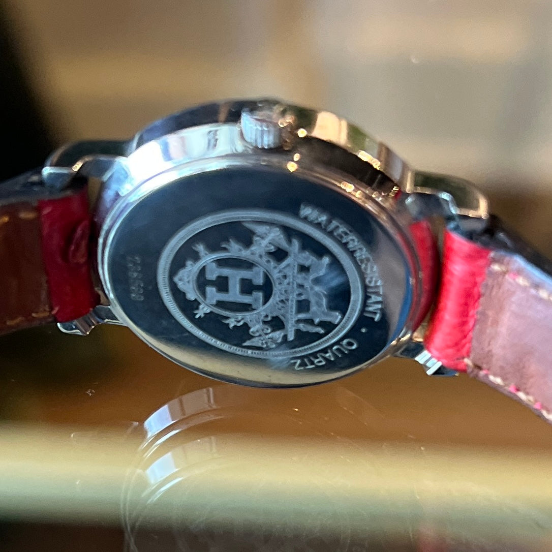 The HERMES Sellier Round Ostrich Watch combines timeless elegance with exceptional craftsmanship. Featuring a distinctive ostrich leather strap and a sleek round case, this watch offers refined sophistication for those who appreciate luxury with subtle character. Its meticulous design ensures both style and durability, making it a perfect accessory for elevated everyday wear. B+ Very Good Condition