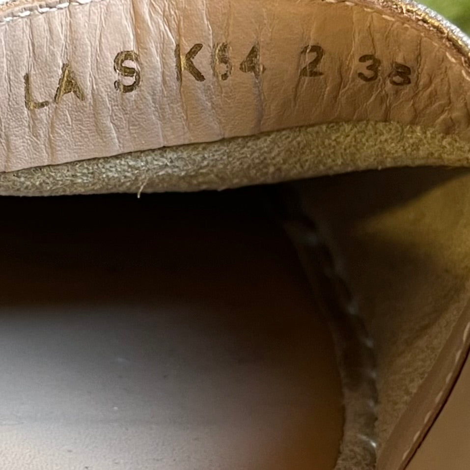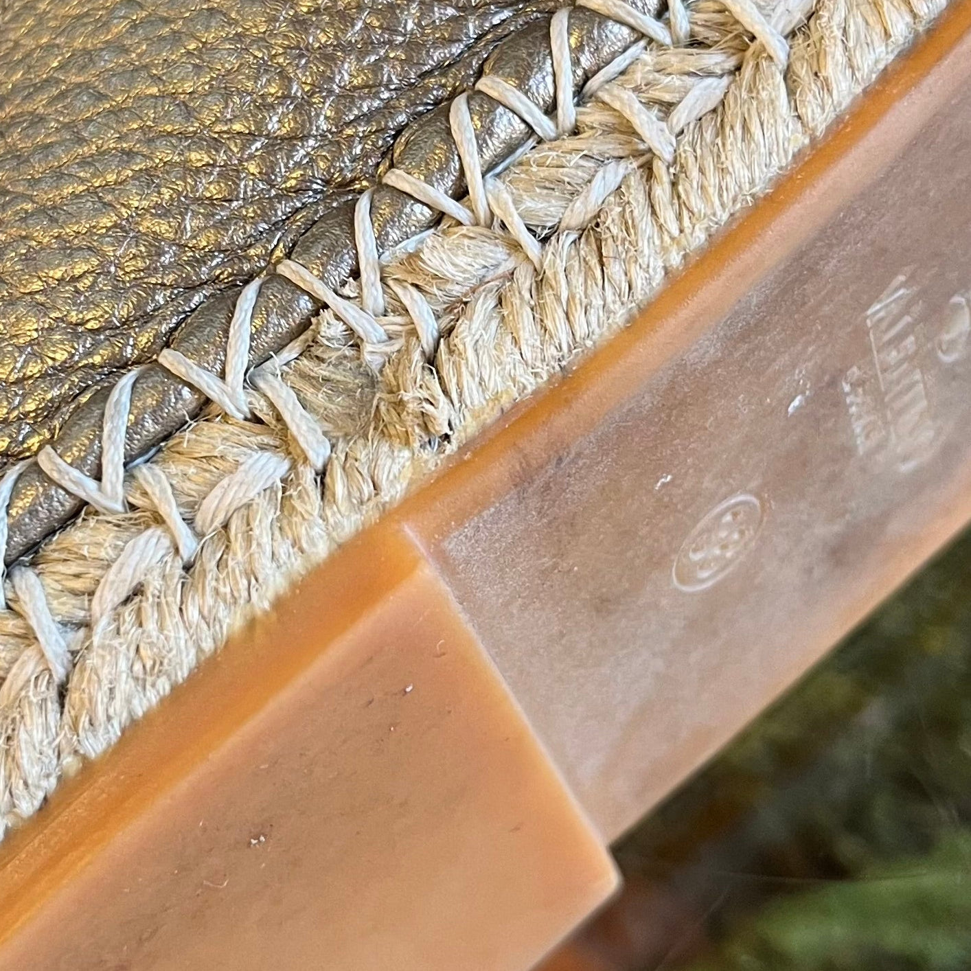 - Exterior: Soles show very gentle wear. Gentle fraying and soiling on espadrilles trim. Color is bright and vibrant. Leather is smooth and supple. Overall very good condition.