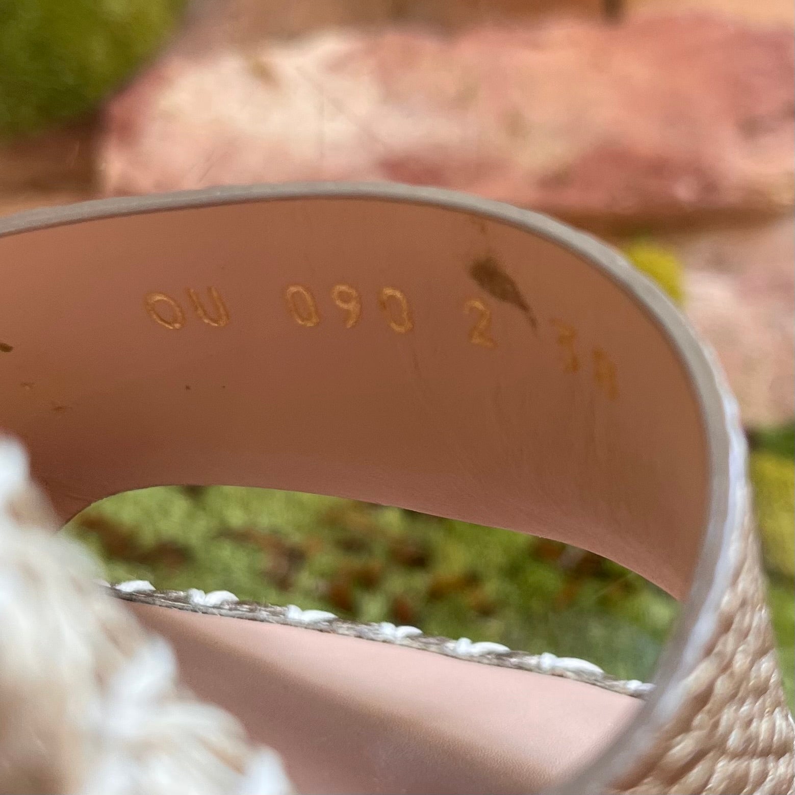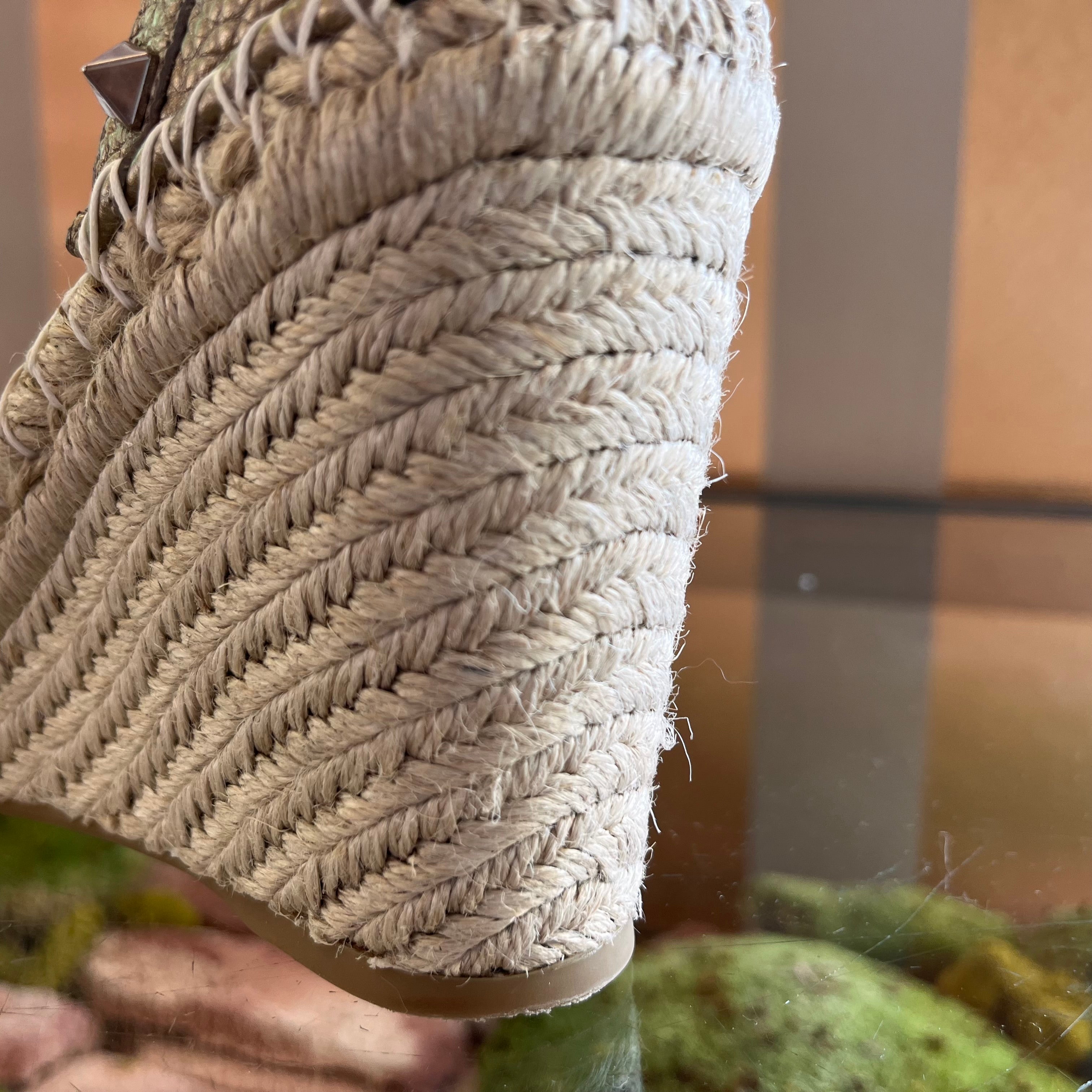 - Exterior: Soles show gentle wear. Jute shows wear and fraying. Color is still bright and vibrant. Leather is smooth and supple. Overall very good condition.