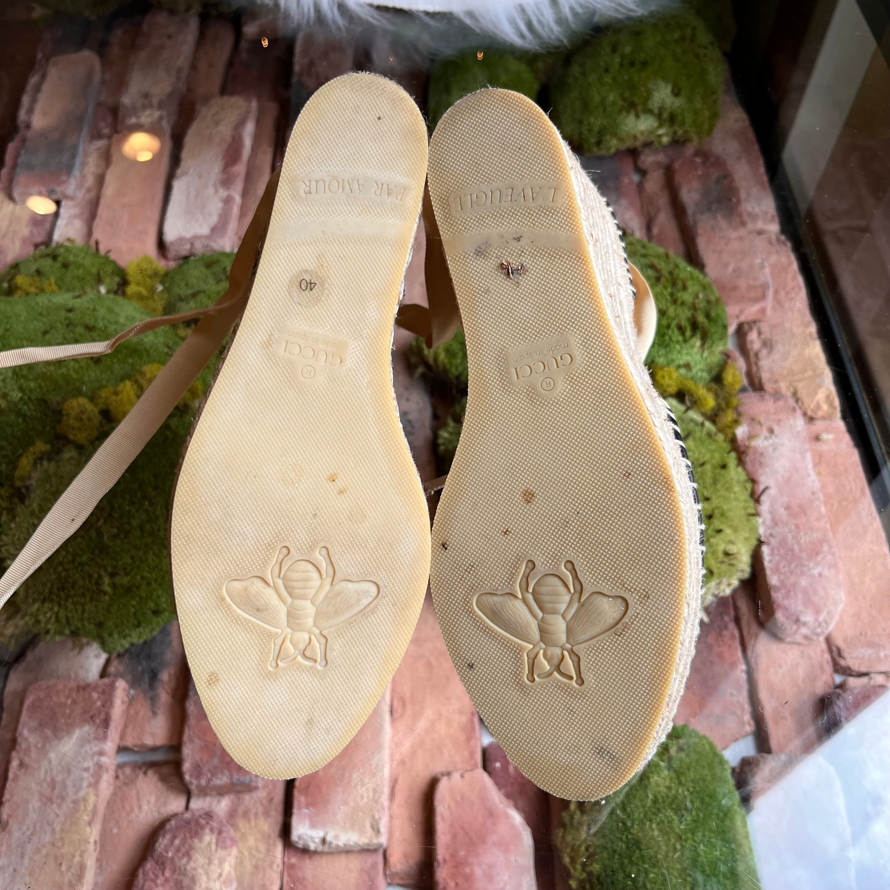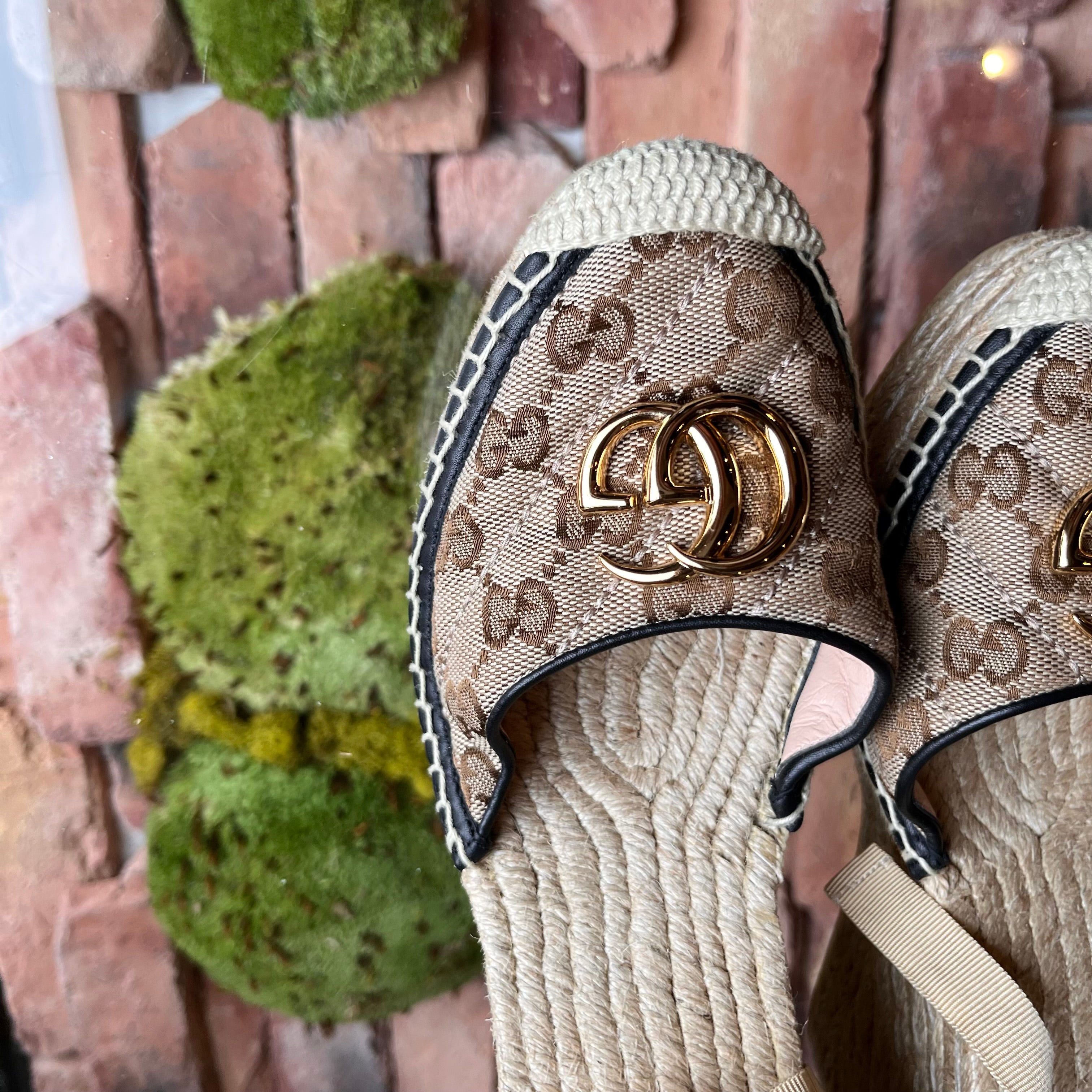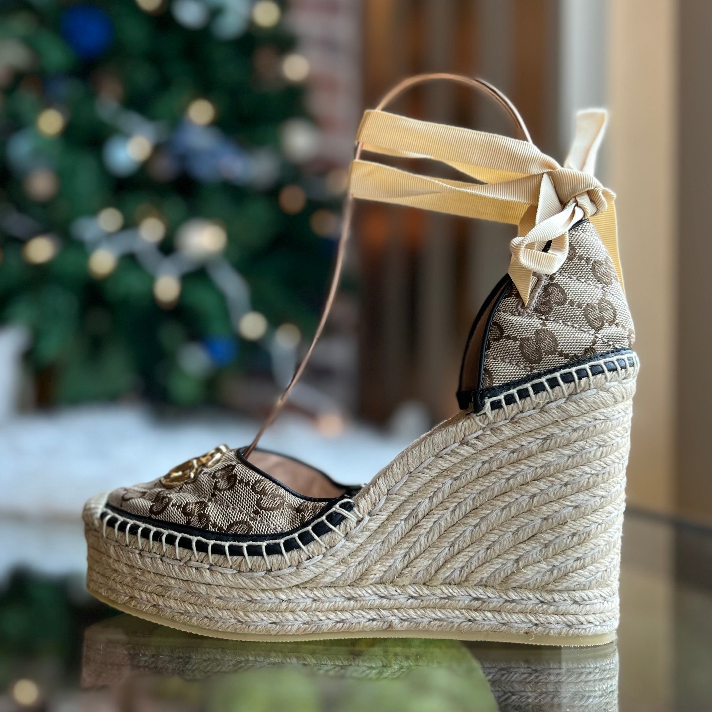 GUCCI Pilar GG Ankle Tie Espadrille Platform Wedges SZ40(10US)