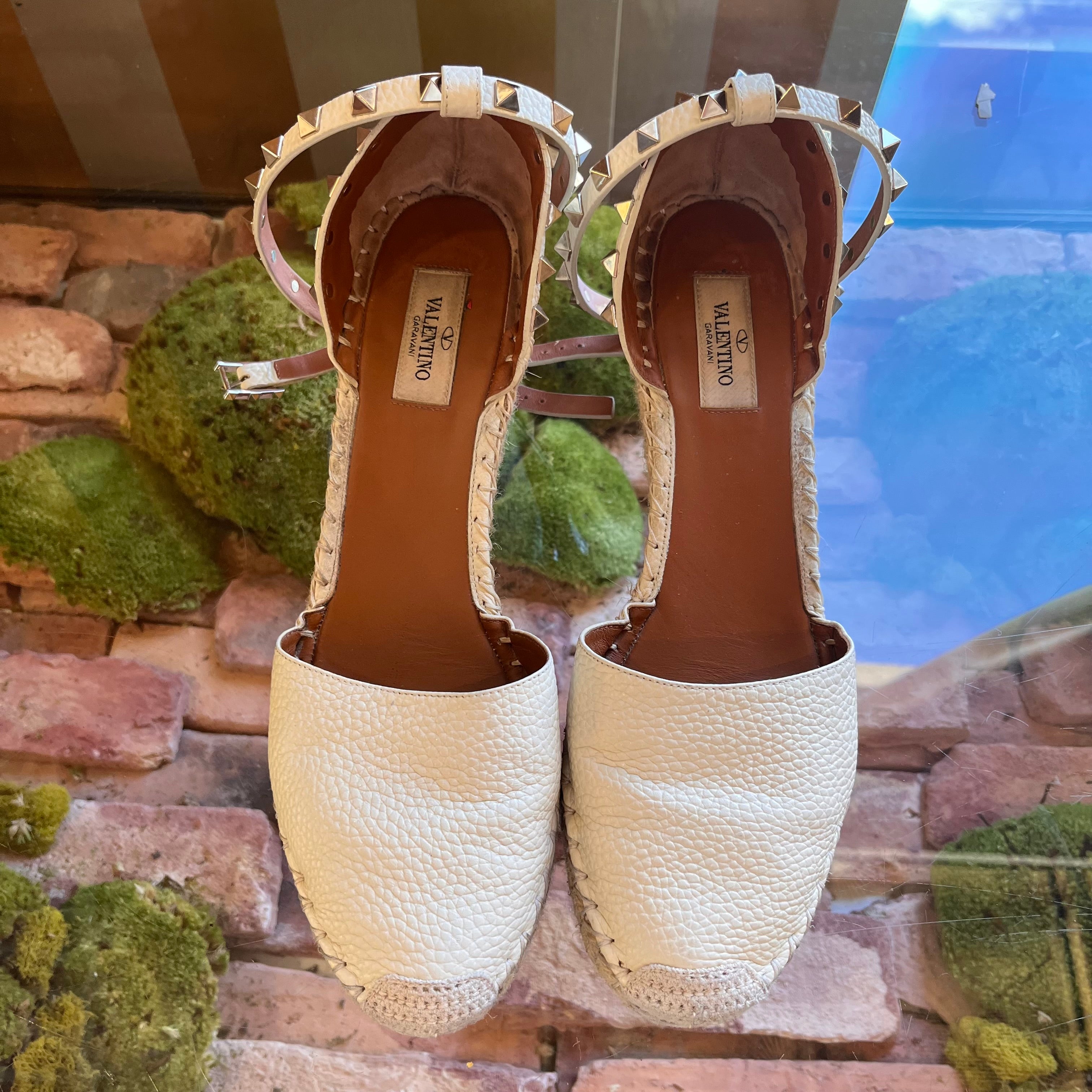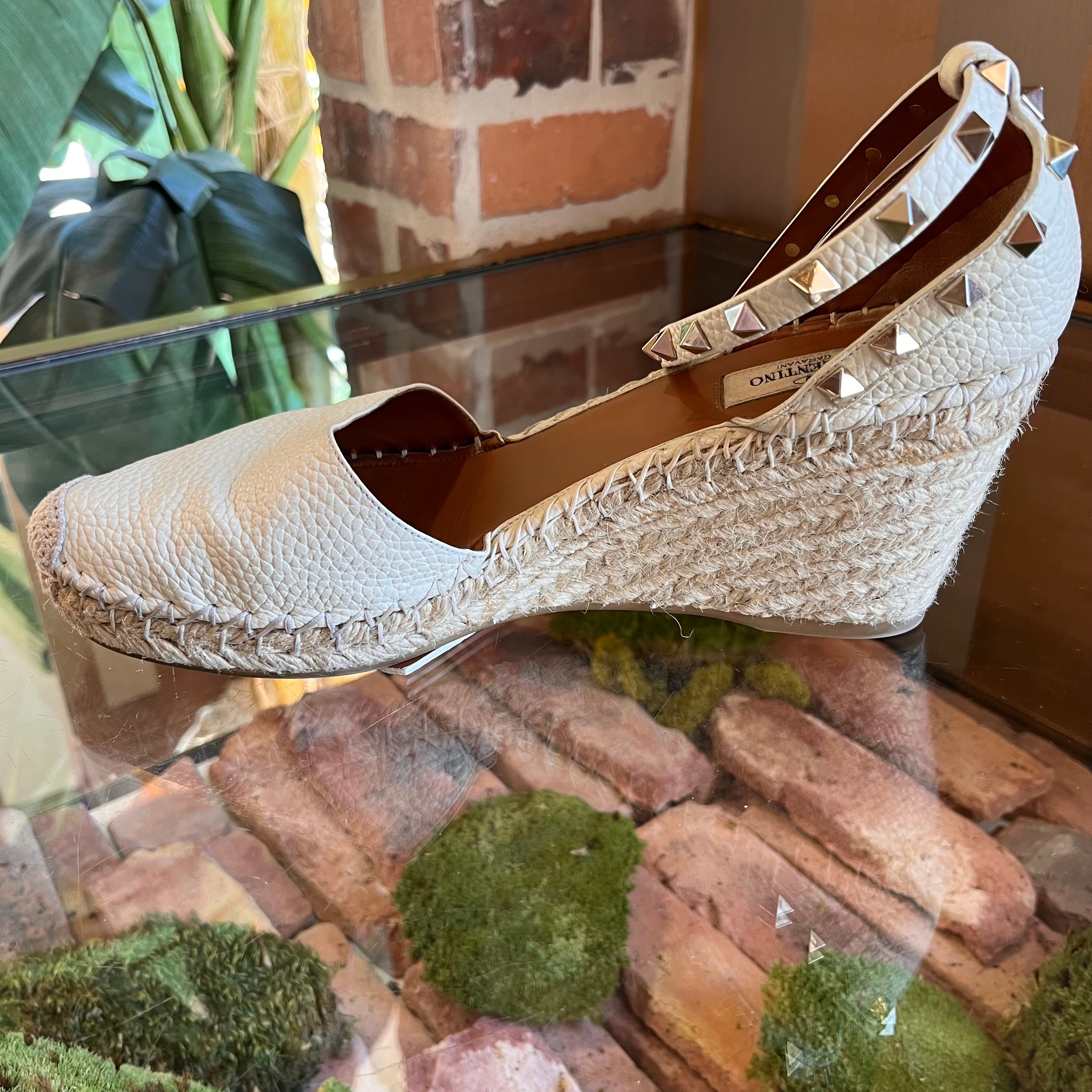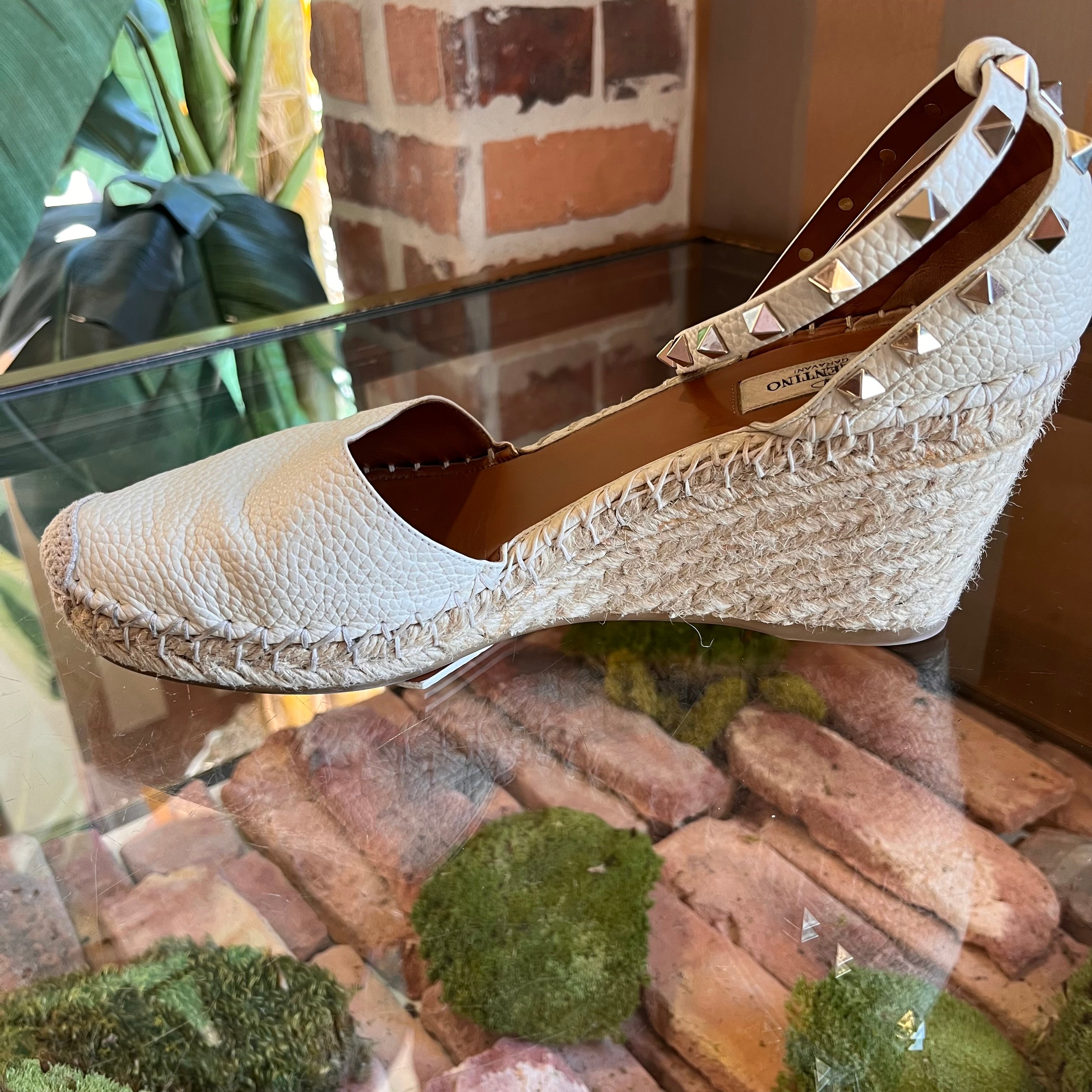 VALENTINO Cream Leather Rockstud Espadrille Wedge Ankle Wrap Pumps siz