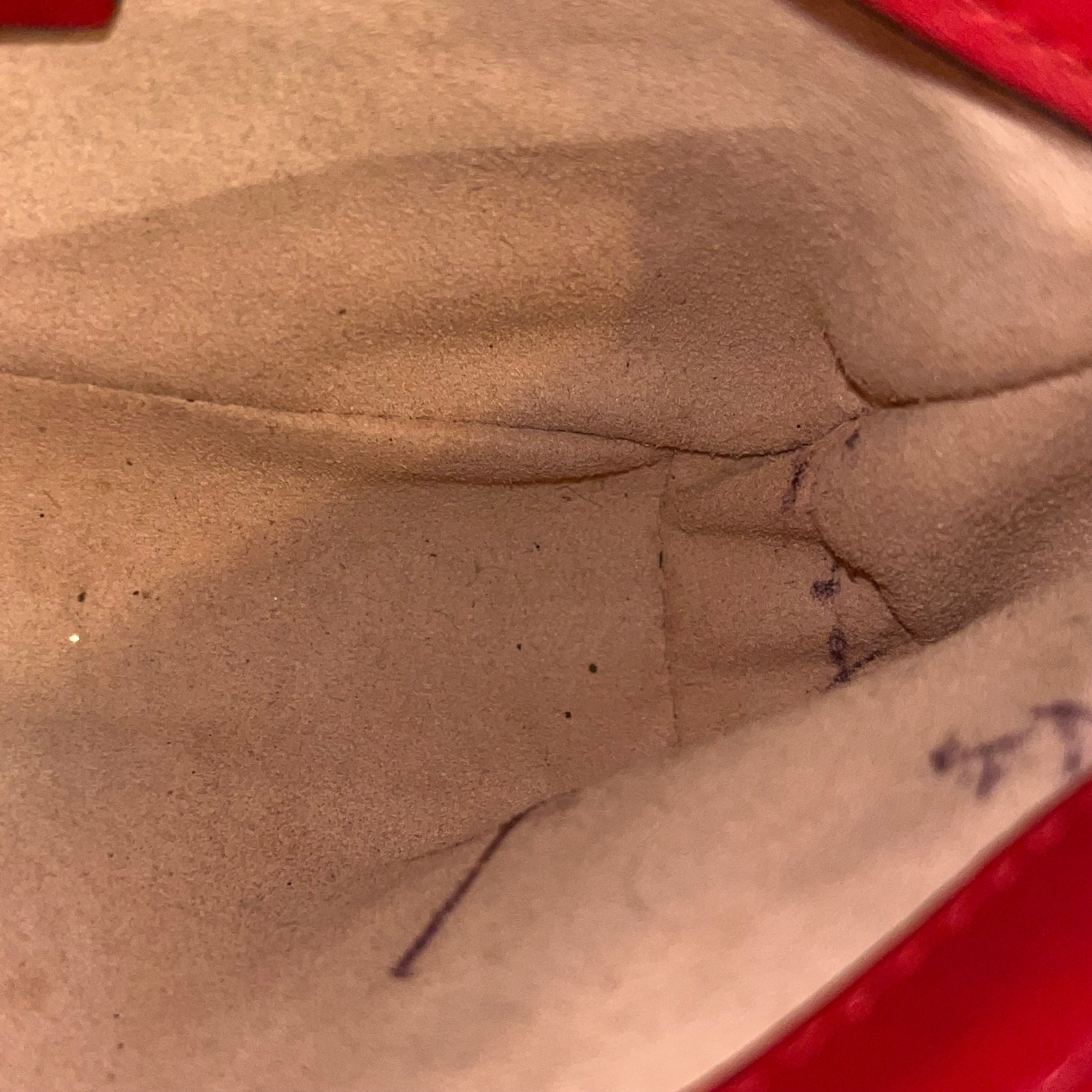 - Interior: The leather lining features rubbing, scratches, markings and wear which may be inherent to the material or a result of handling. The interior has stains but it could possibly be cleaned if desired after purchase although it is wearable as is