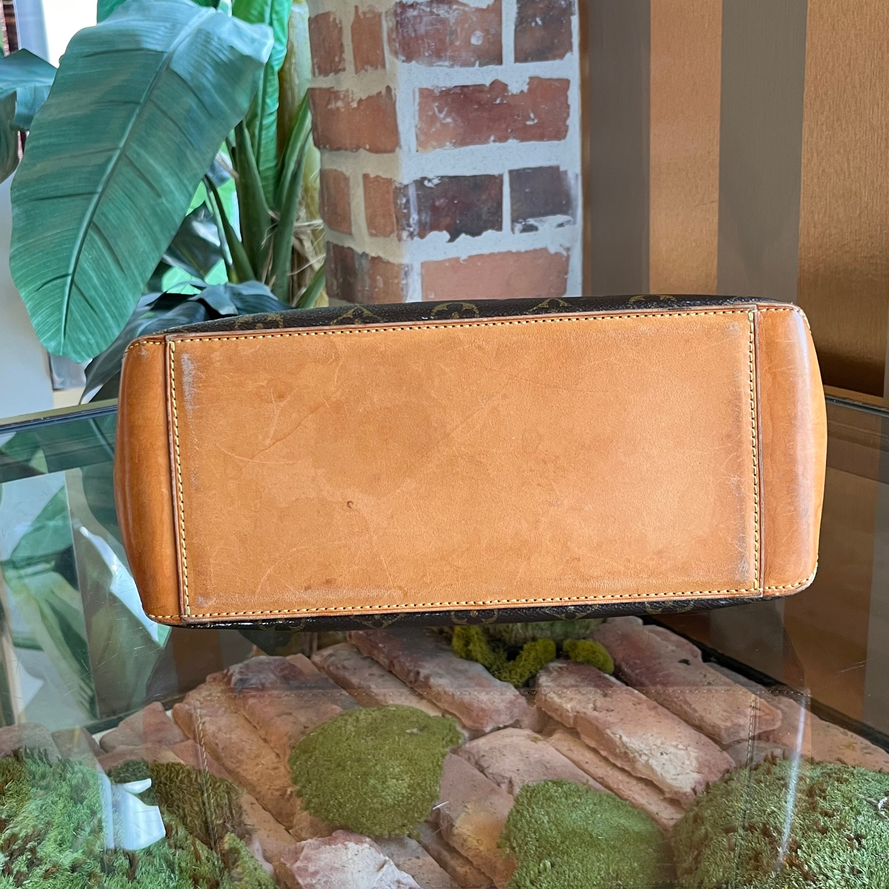 - Exterior: The vachetta leather has developed a medium patina displaying wear at the base such as: soiling, rubbing, scuffing, scratches water/oil spots and staining. The coated canvas exhibits creasing throughout with small white transfer marks. It remains vibrant and beautiful.
