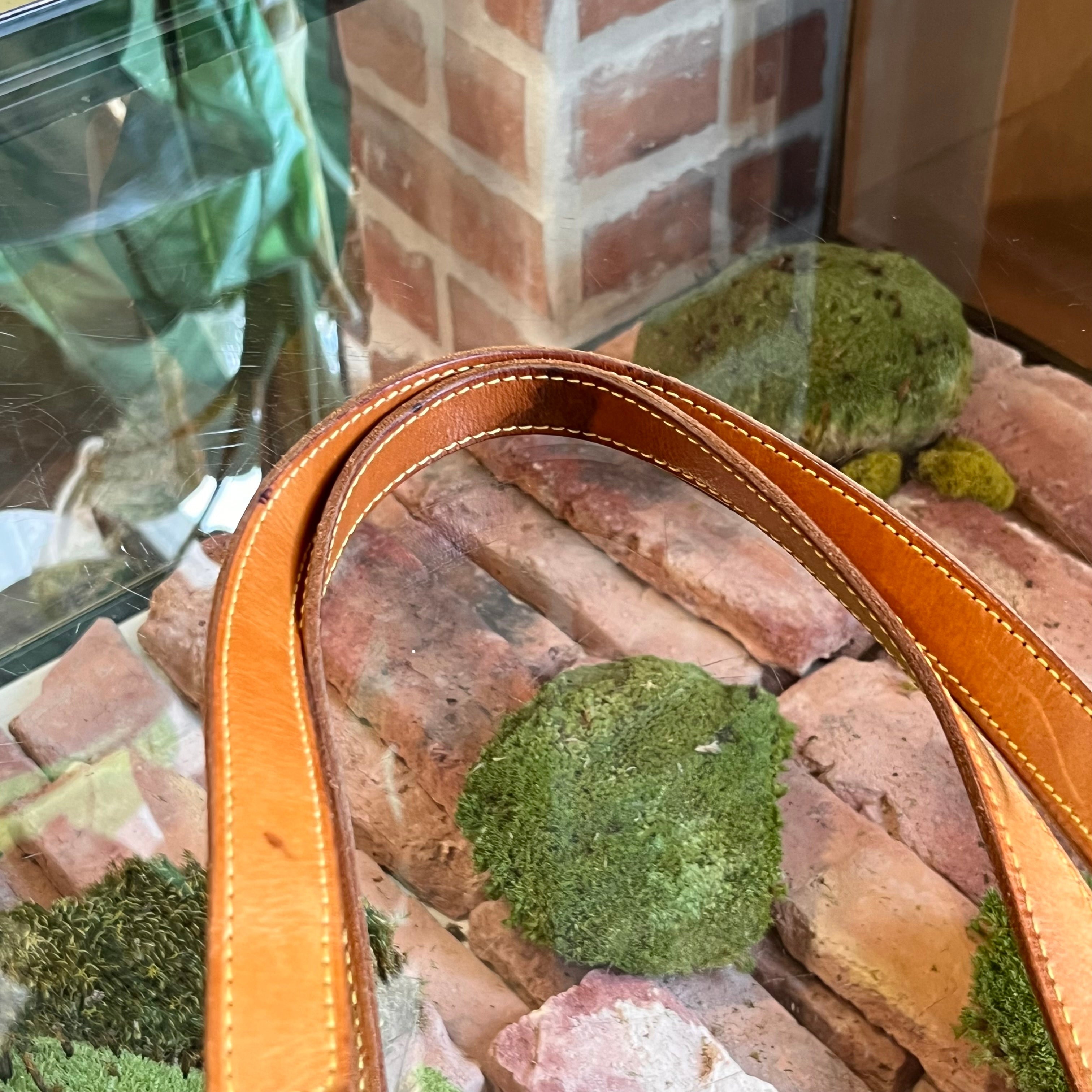- Handle: The straps have developed a caramel patina displaying wear such as: creasing throughout, soiling, glazing wear, appearing darker at the top, scratches along with water/oil spots.