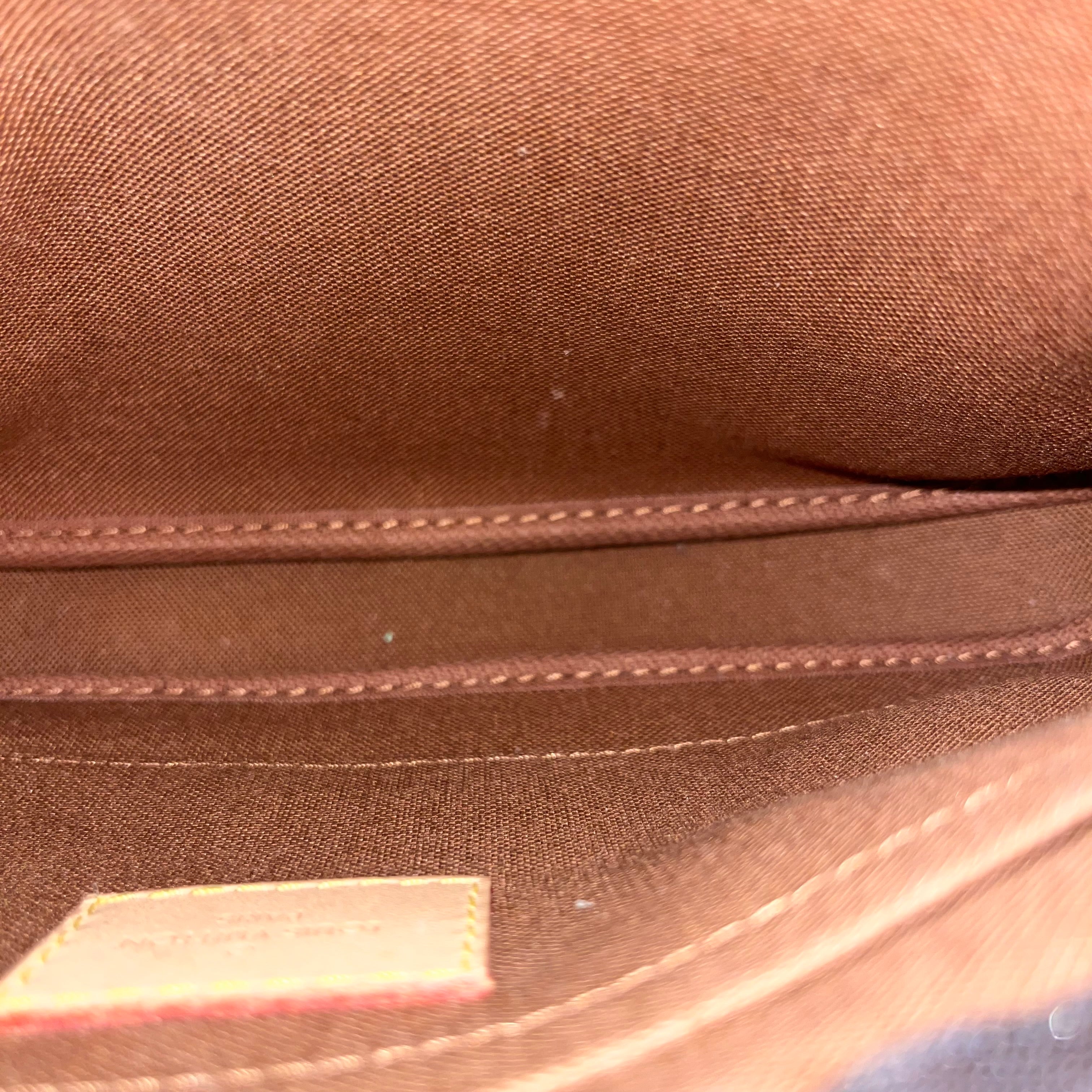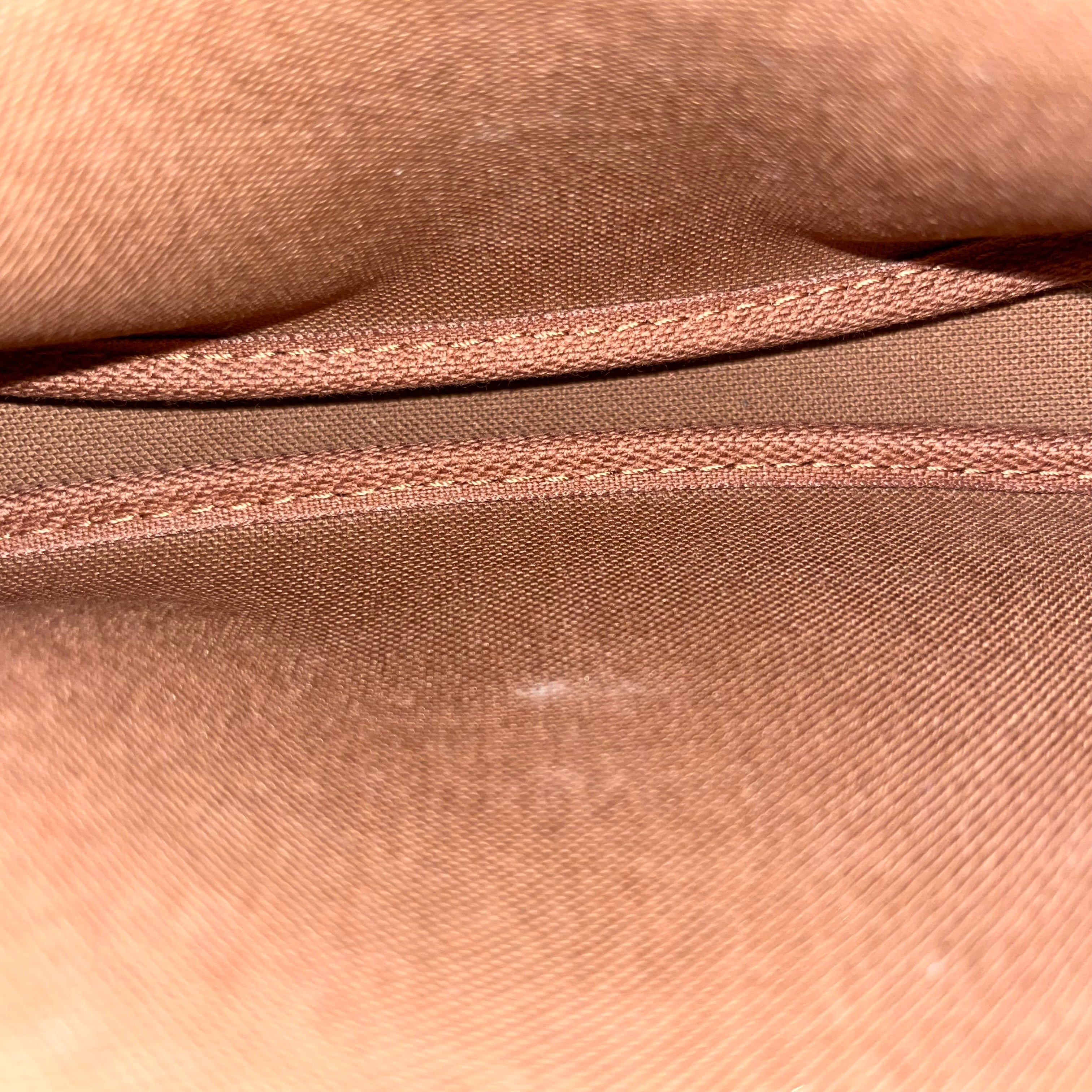 - Exterior: The vachetta leather tab has developed a medium honey patina with slight soiling, oil/water marks, scratches. The coated canvas is vibrant and beautiful. Overall it's in very good condition.