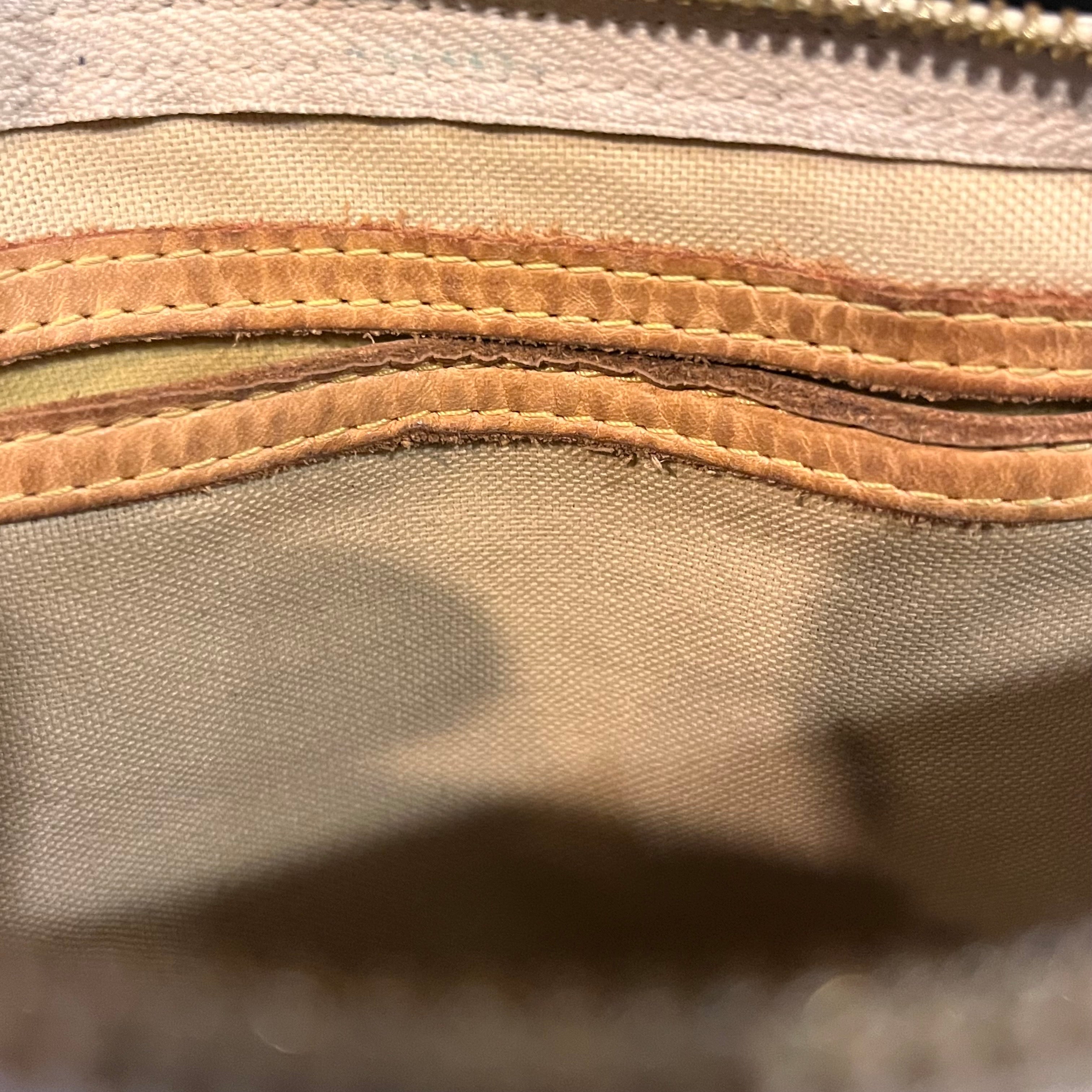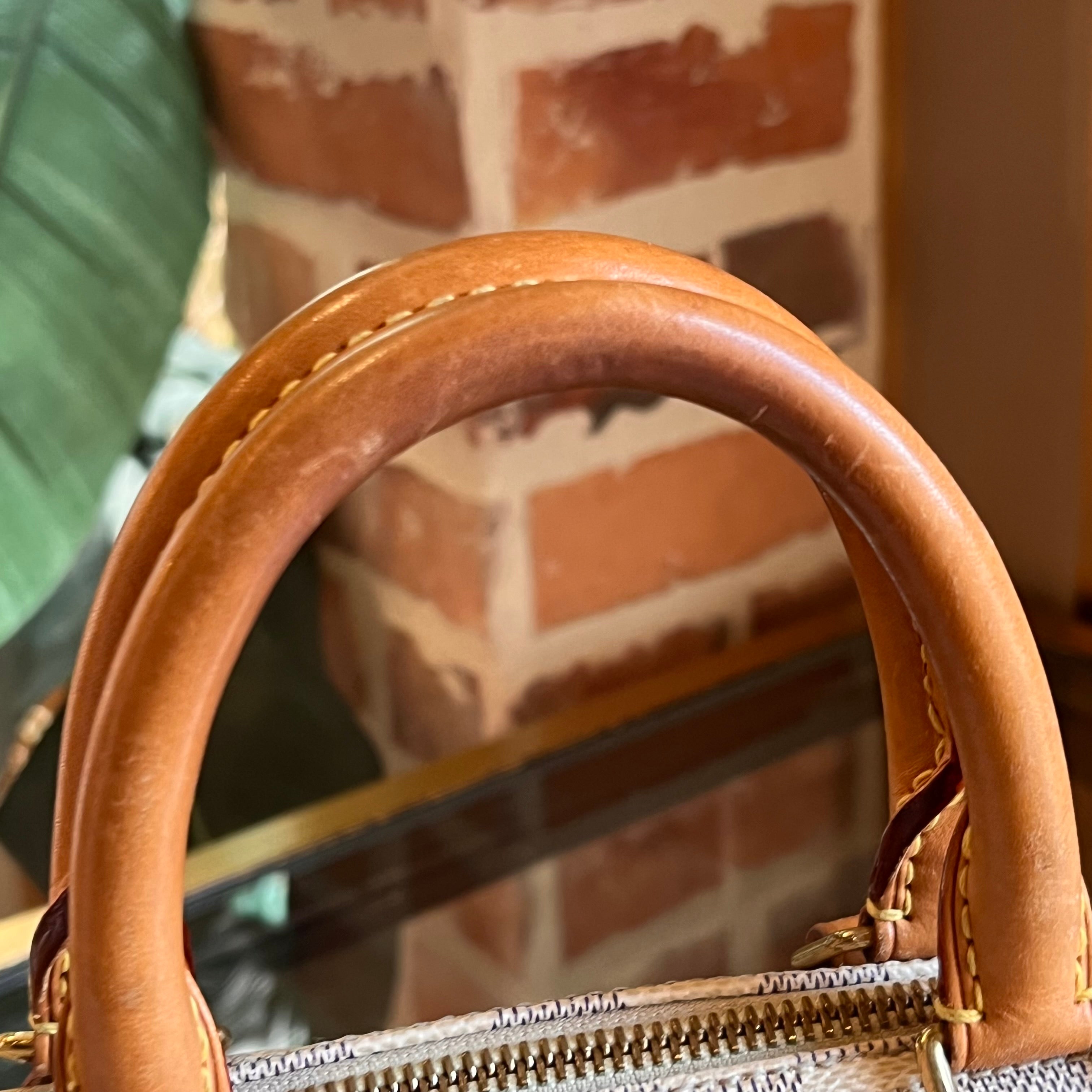 - Handle + Vachetta Trim: The vachetta leather has patianed displaying wear such as: water spots, scuffing, soiling, rubbing, markings, creasing, scratches while appearing darker in certain areas(please refer to photos).