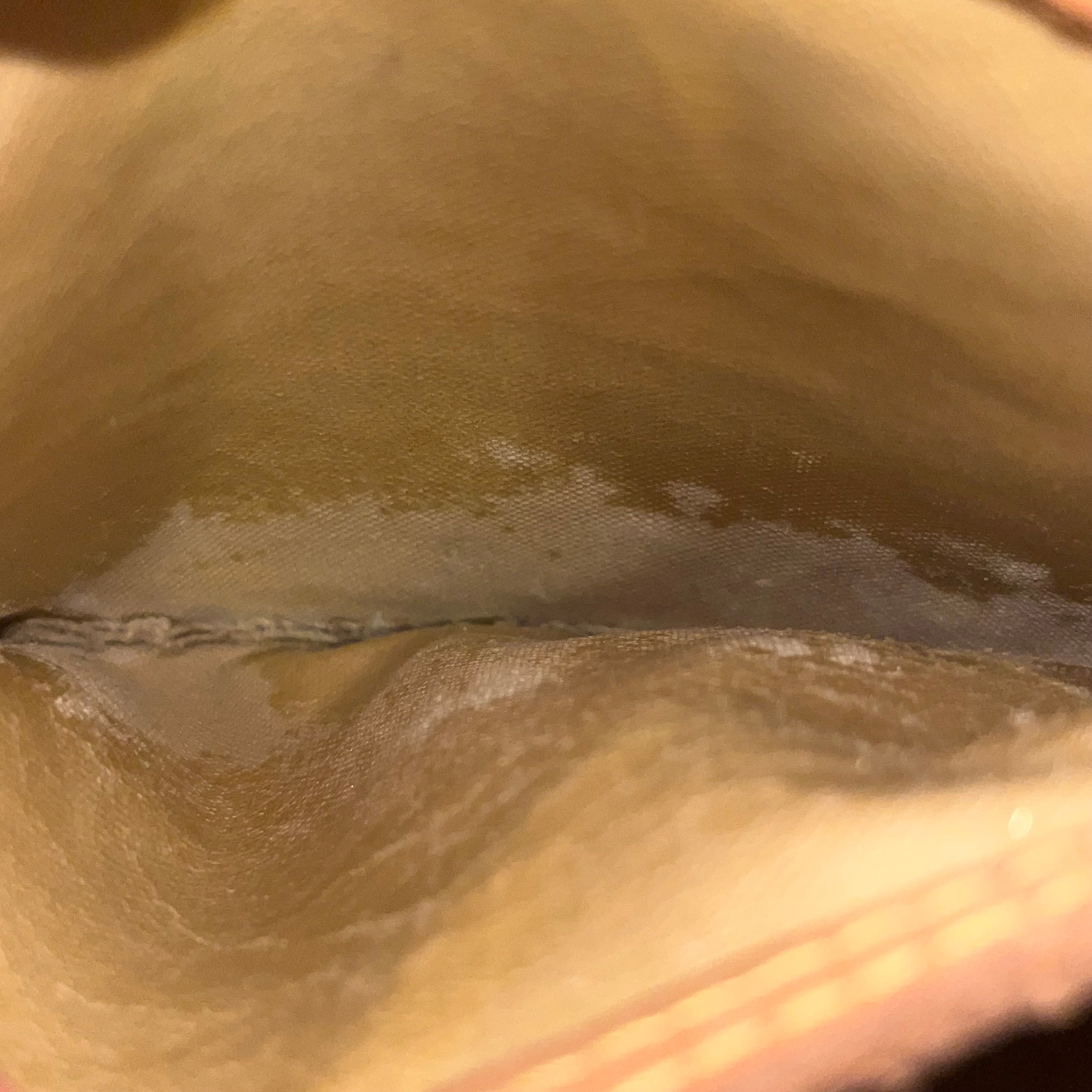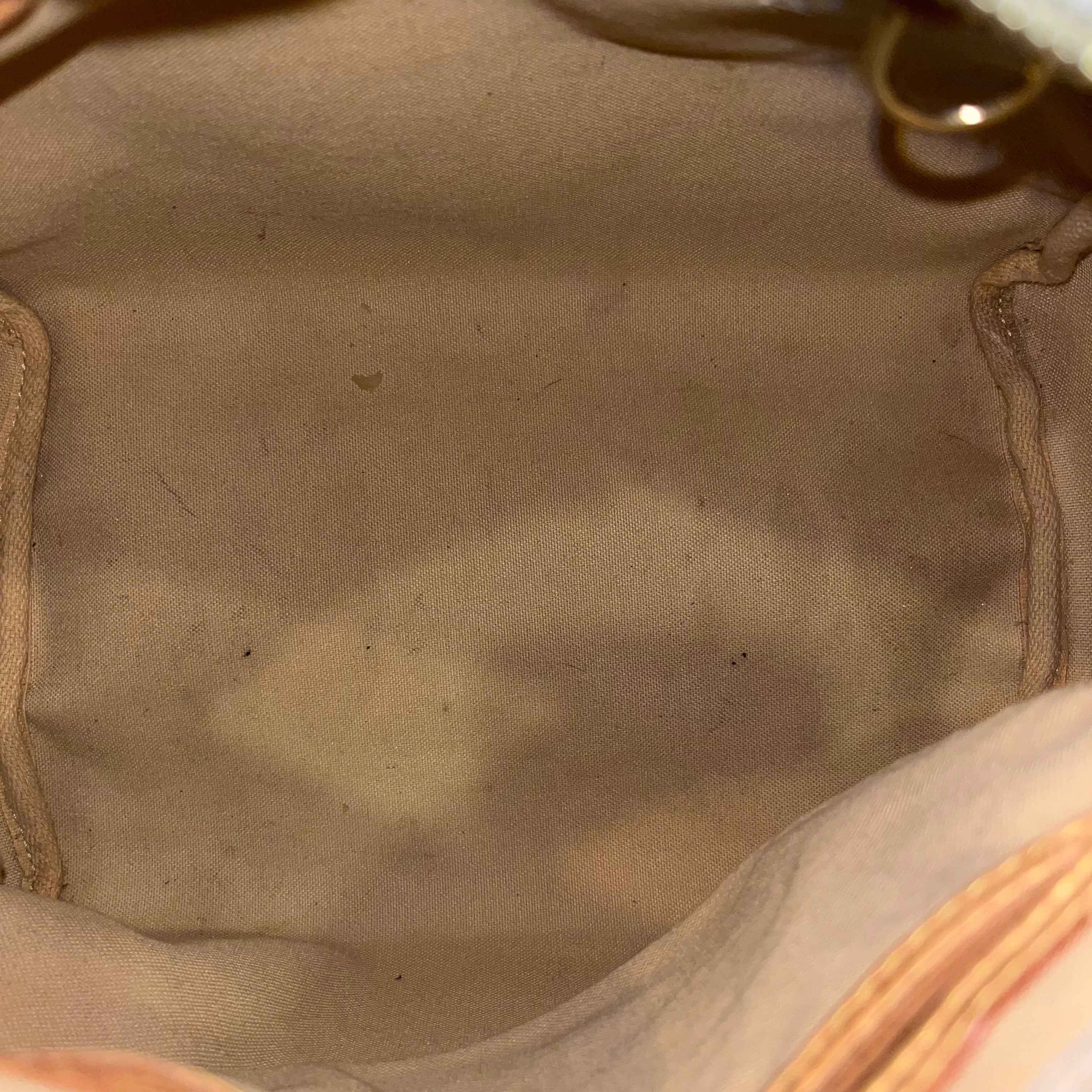 - Interior: The interior is stained but it could possibly be cleaned if desired after purchase although it is wearable as is. Please note that due to the natural aging process, the interior lining of the pocket exhibits deterioration—though it remains intact, not powdery or flaking. While the lining is fully usable as-is, some collectors may choose to have it professionally relined for longevity. This does not affect the bag’s structural integrity