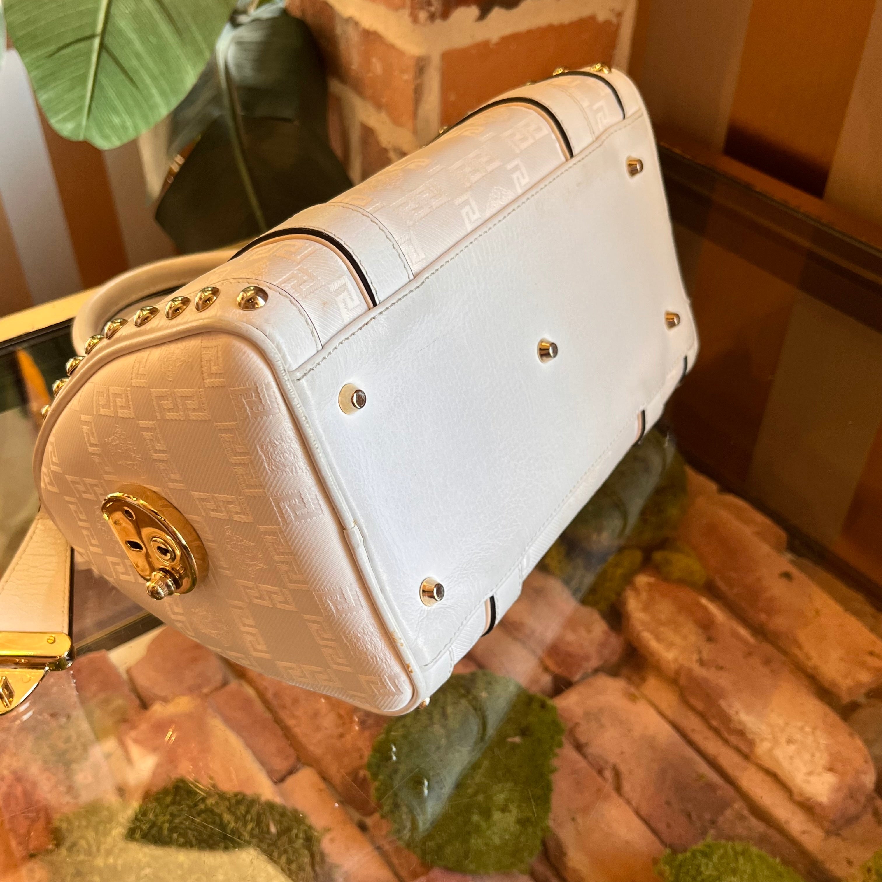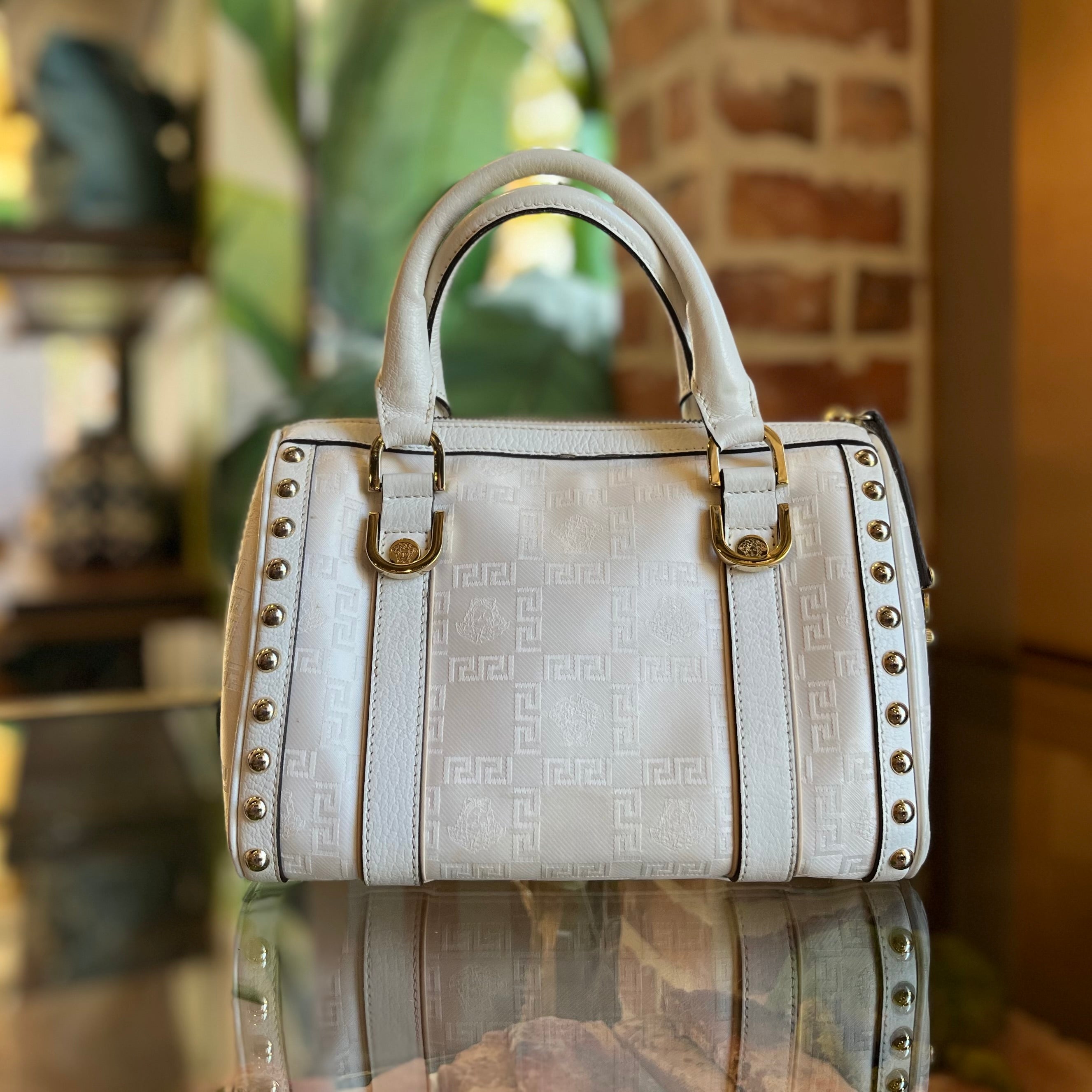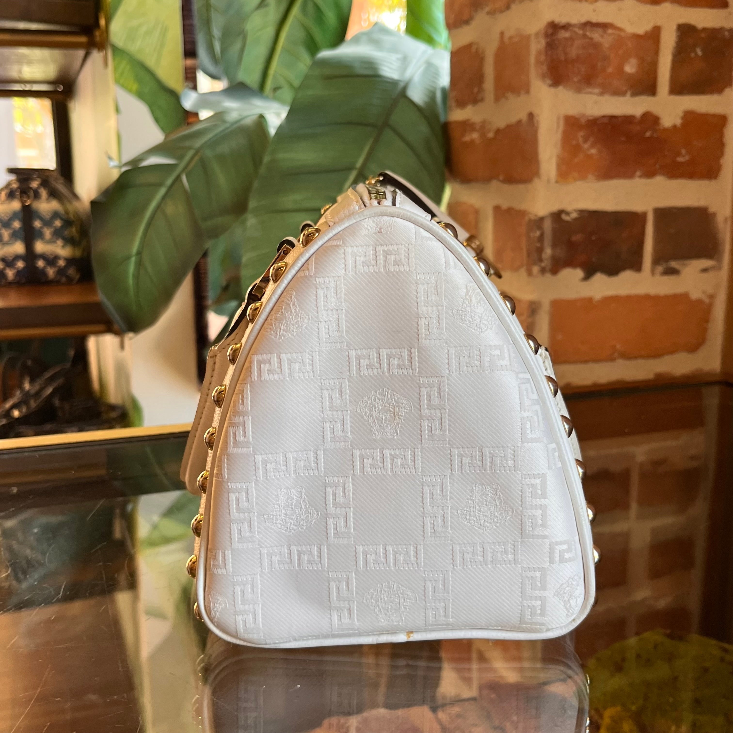 VERSACE Boston White Logo Jacquard Canvas Studded Satchel Bag