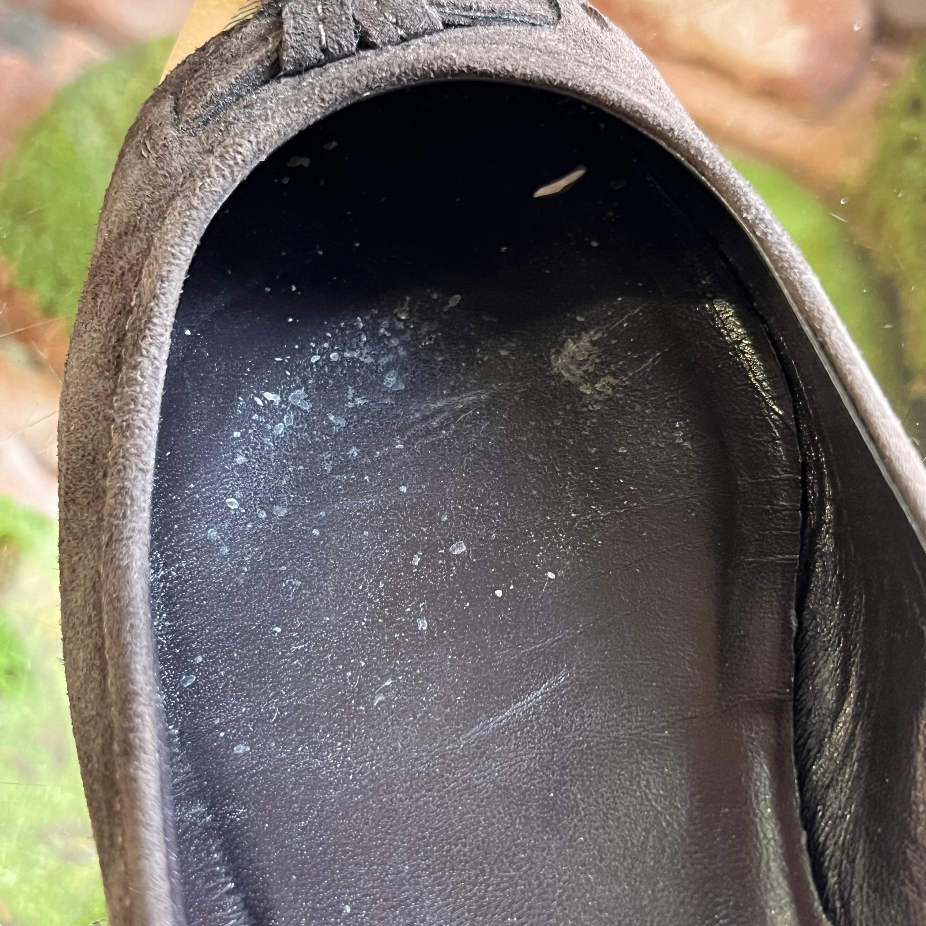 • Exterior: The soles are worn consistently with previous moderate use. The suede displays moderate rubbing with scratches remaining vibrant and unfaded. The coated canvas displays soiling with gentle marks. It remains wearable as is with  a refined appearance. Overall, it's in good condition.