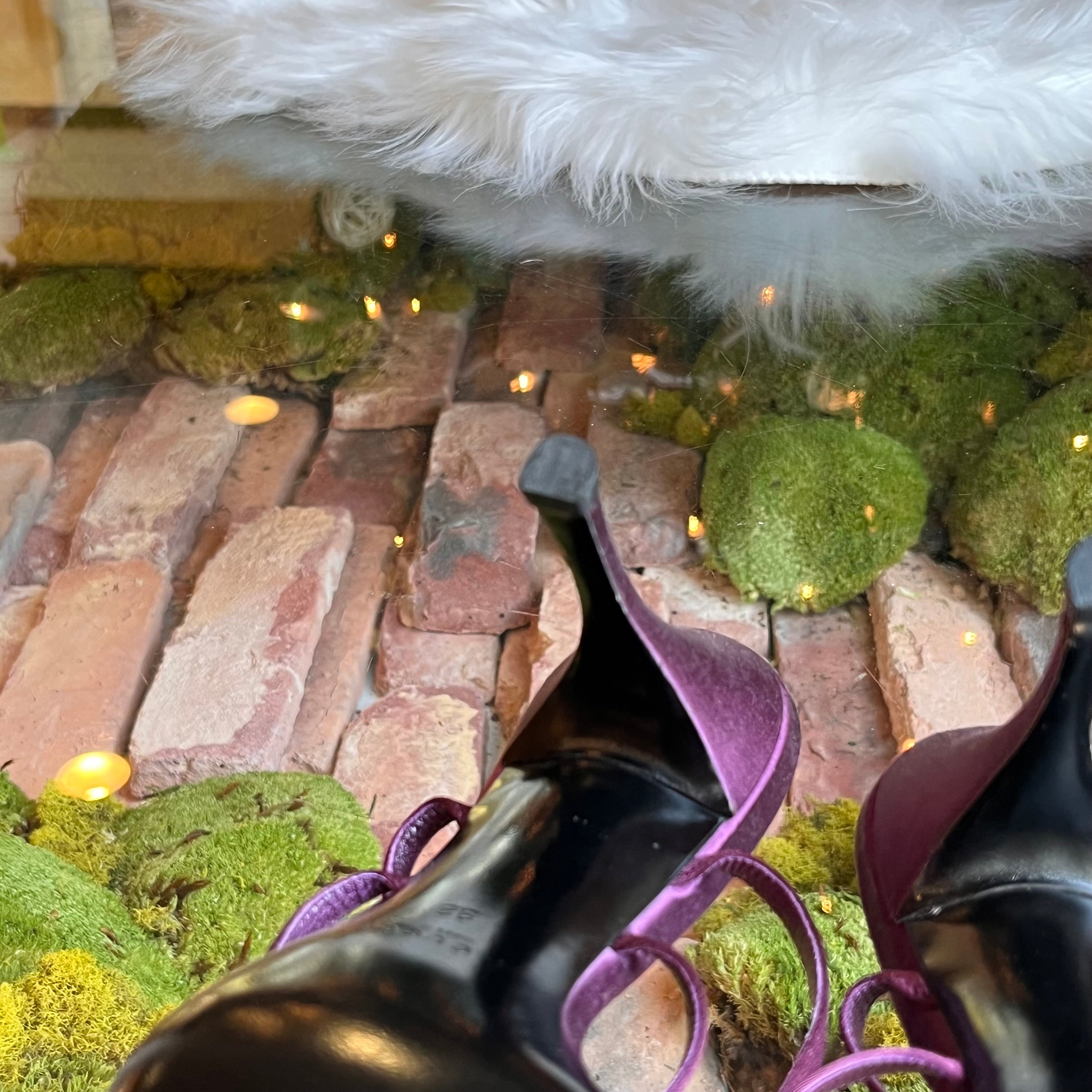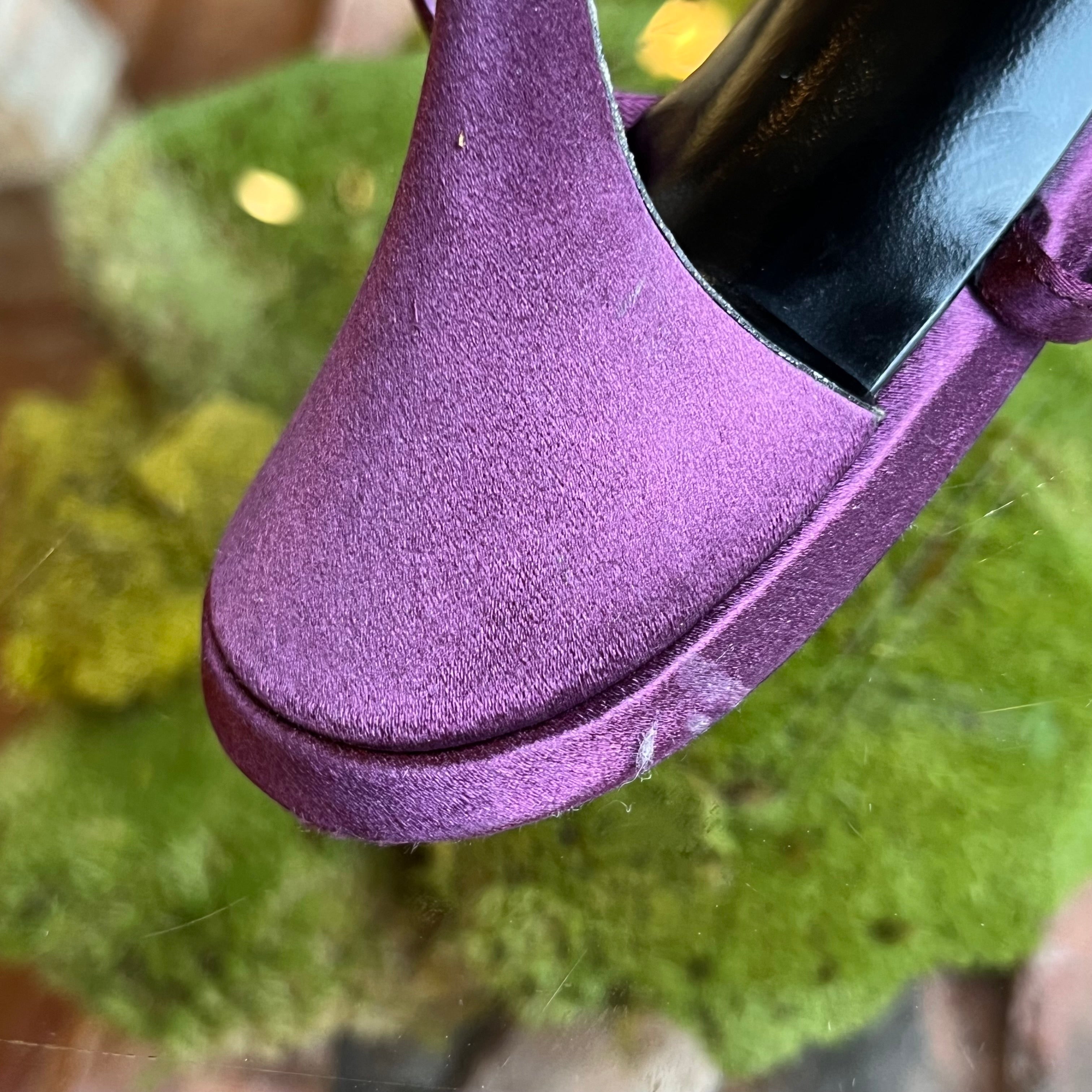 - Exterior: The soles are worn consistently with previous mild use. Uneven heel. The satin displays gentle surface wear. Overall it's in very good condition.