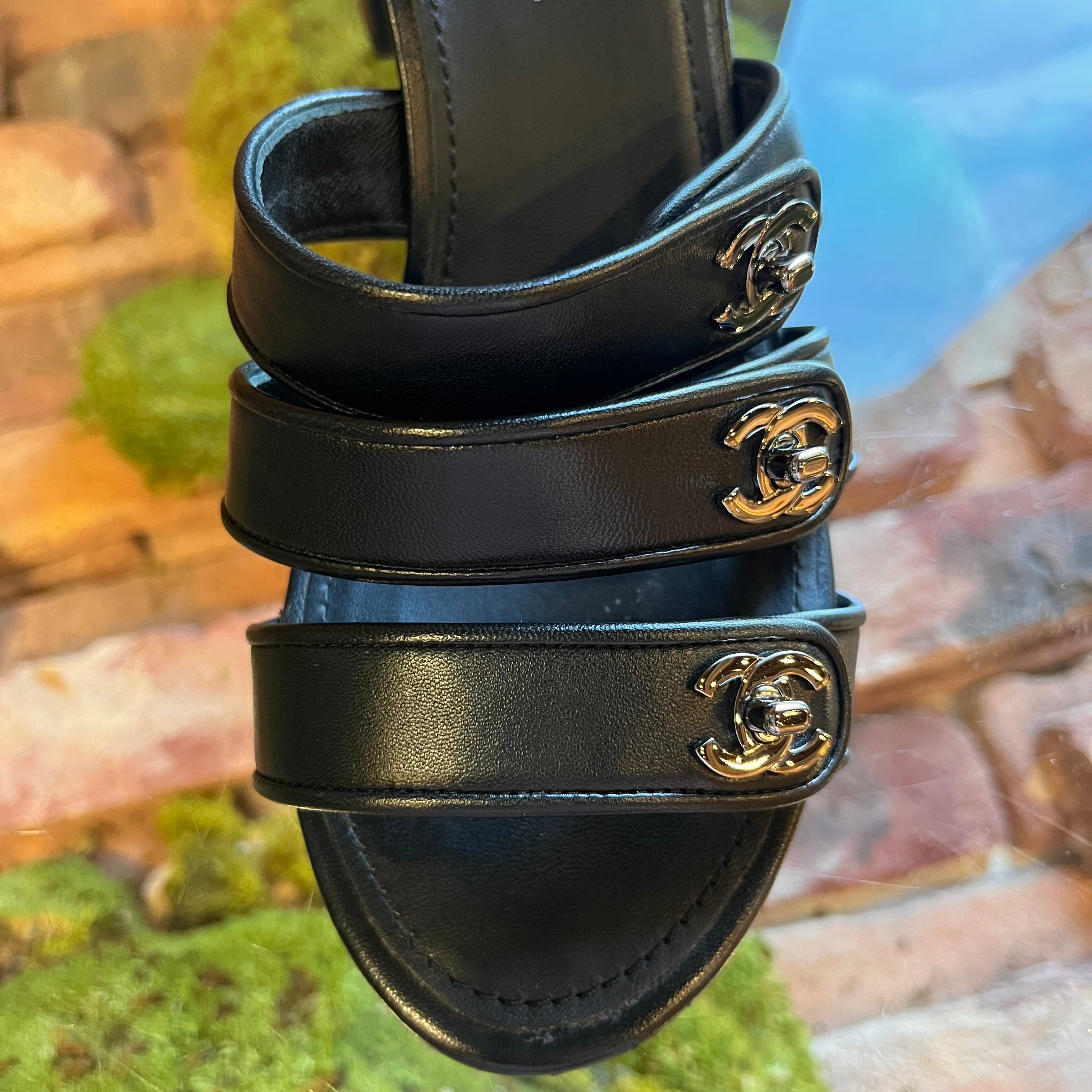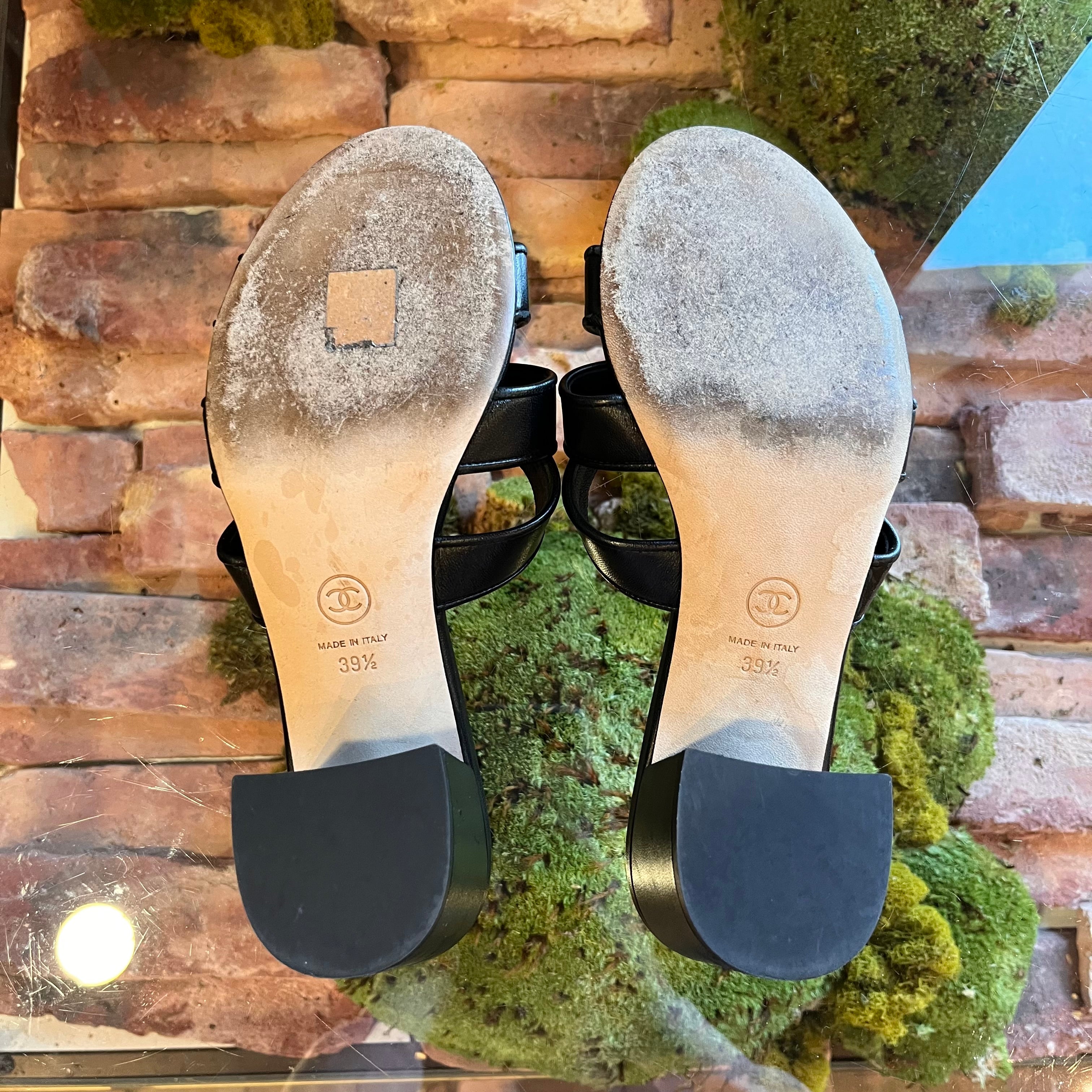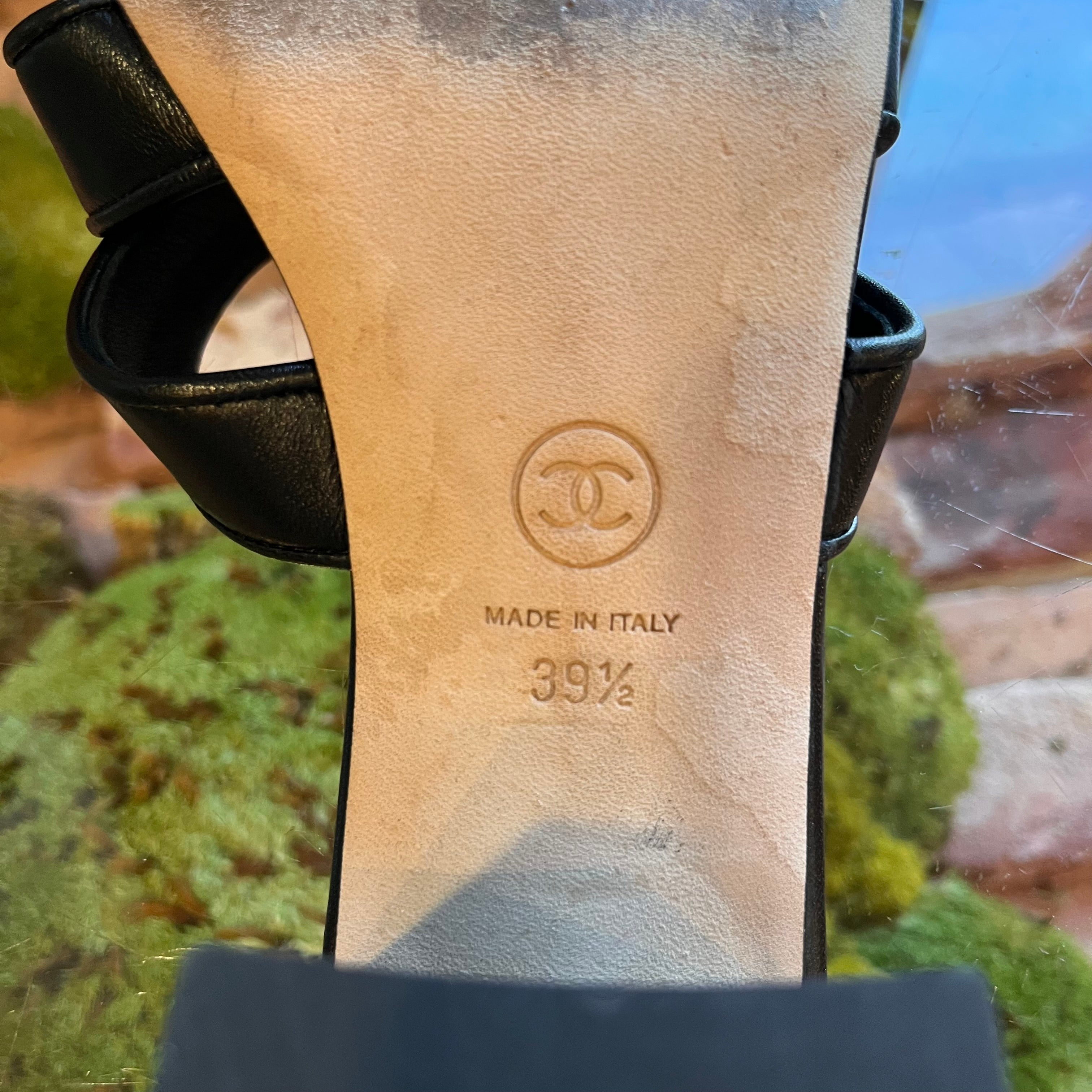 CHANEL Black Leather CC Turn Lock Block Heel Sandals SZ 39.5 (US 9.5)