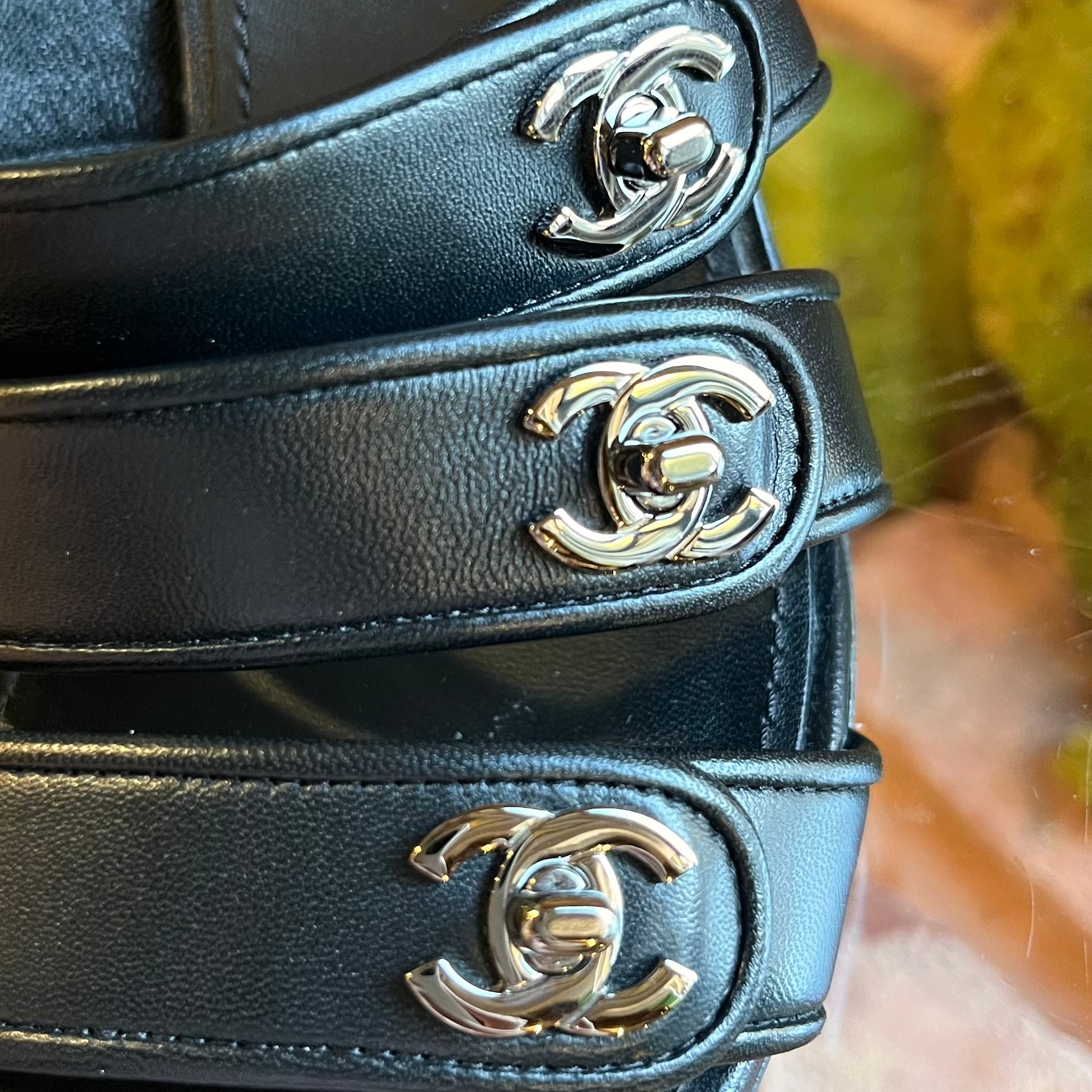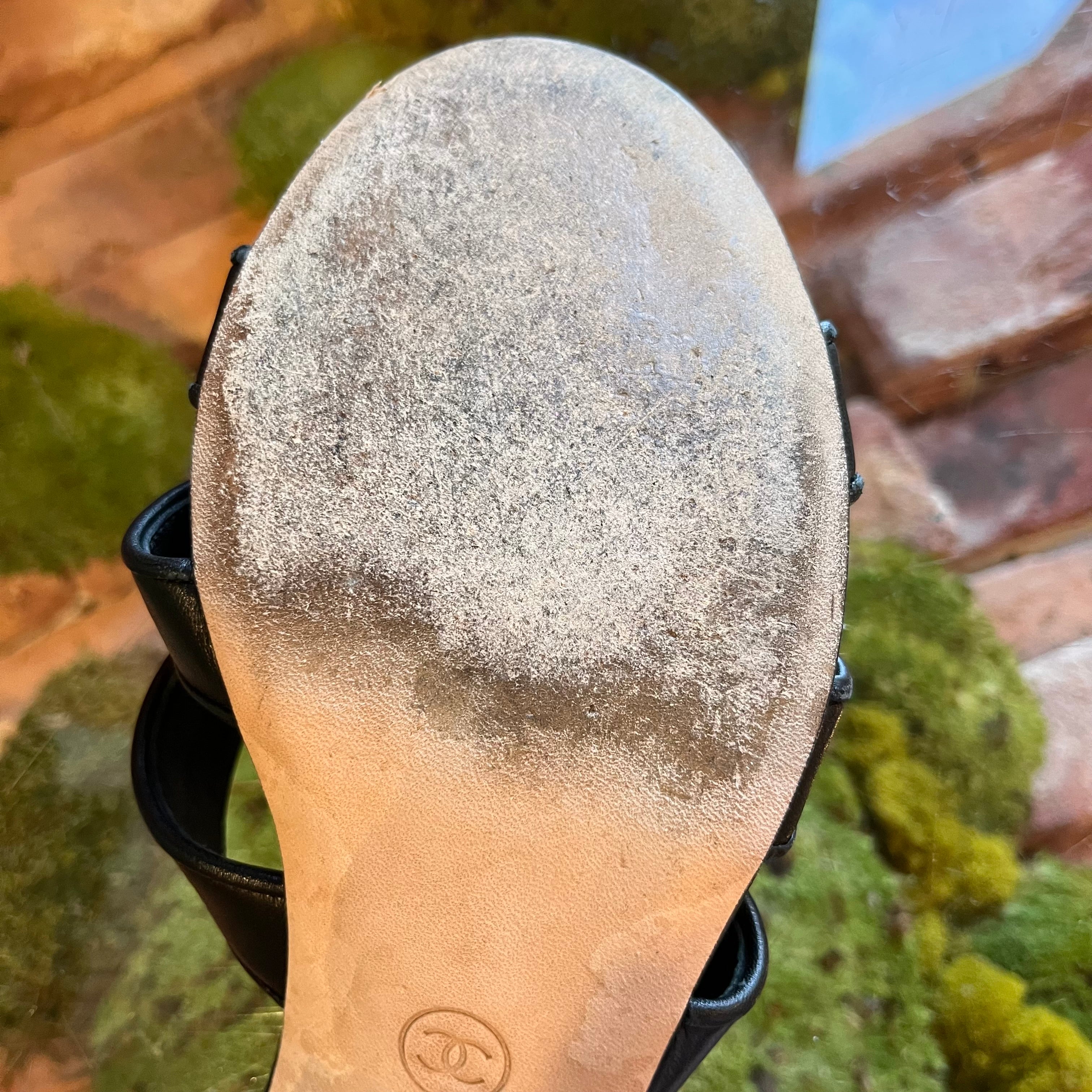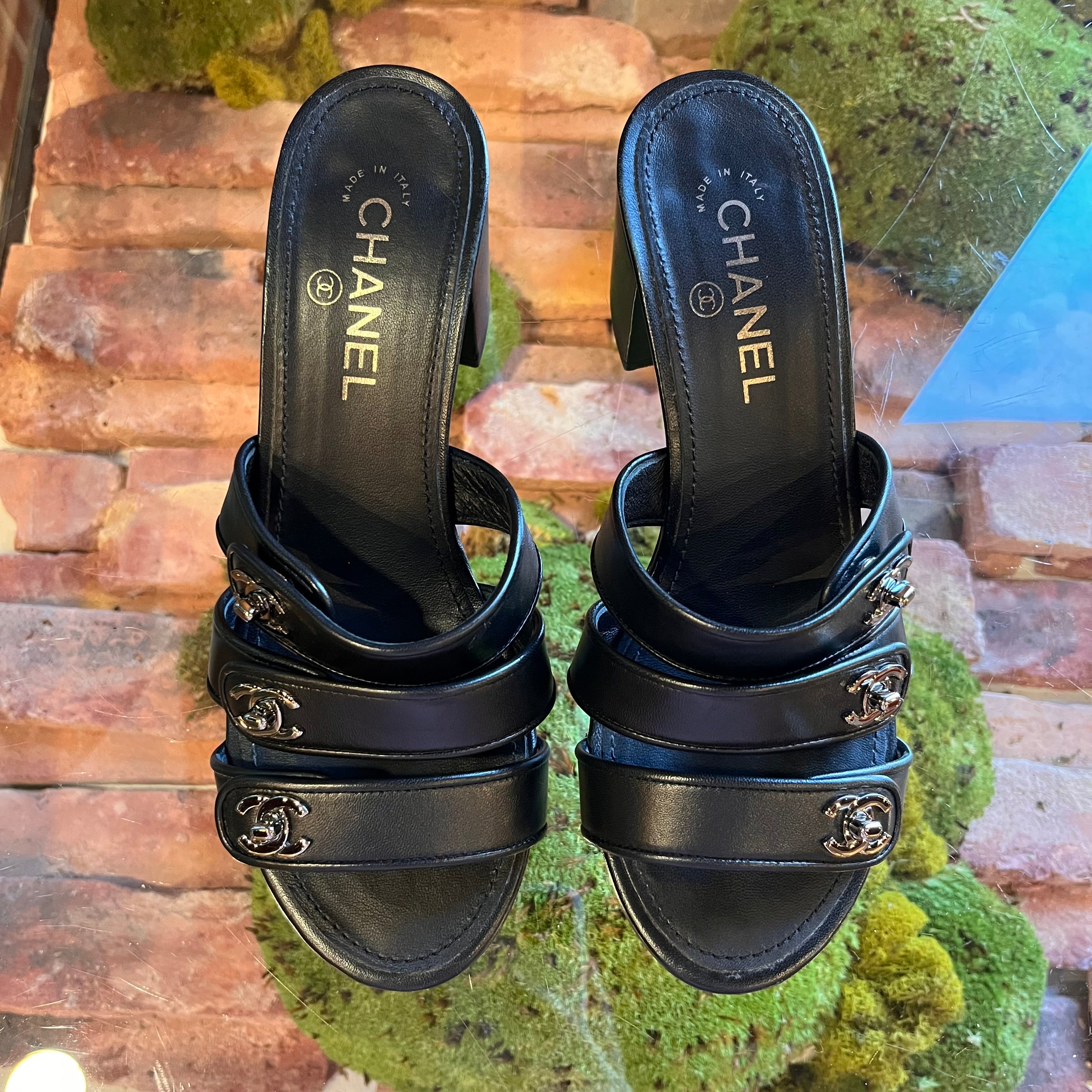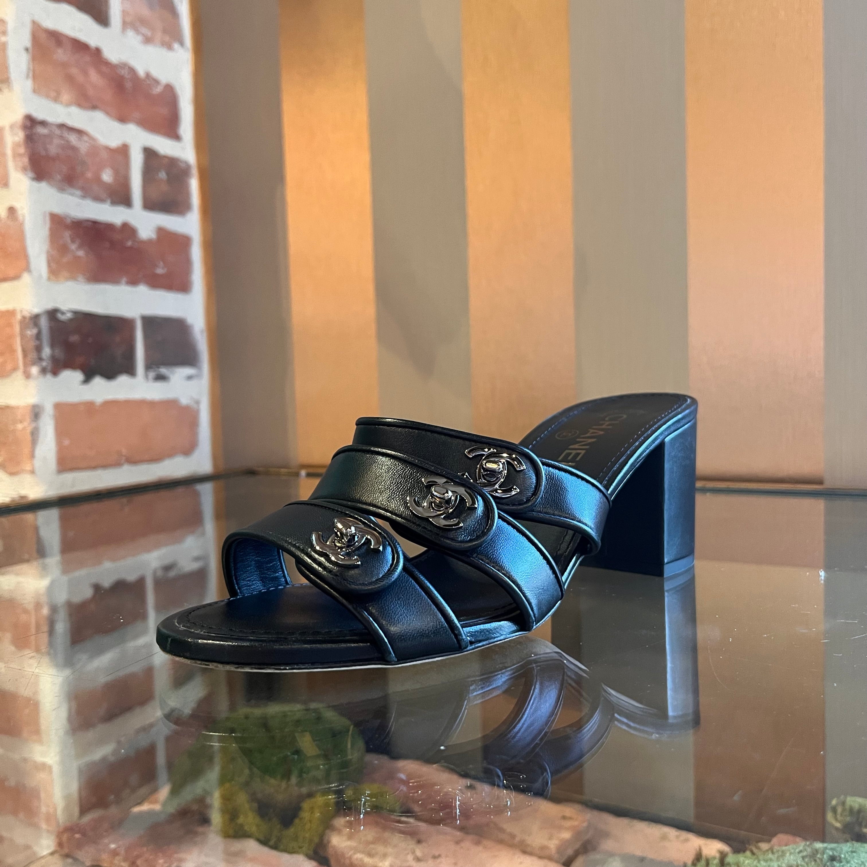 CHANEL Black Leather CC Turn Lock Block Heel Sandals SZ 39.5 (US 9.5)