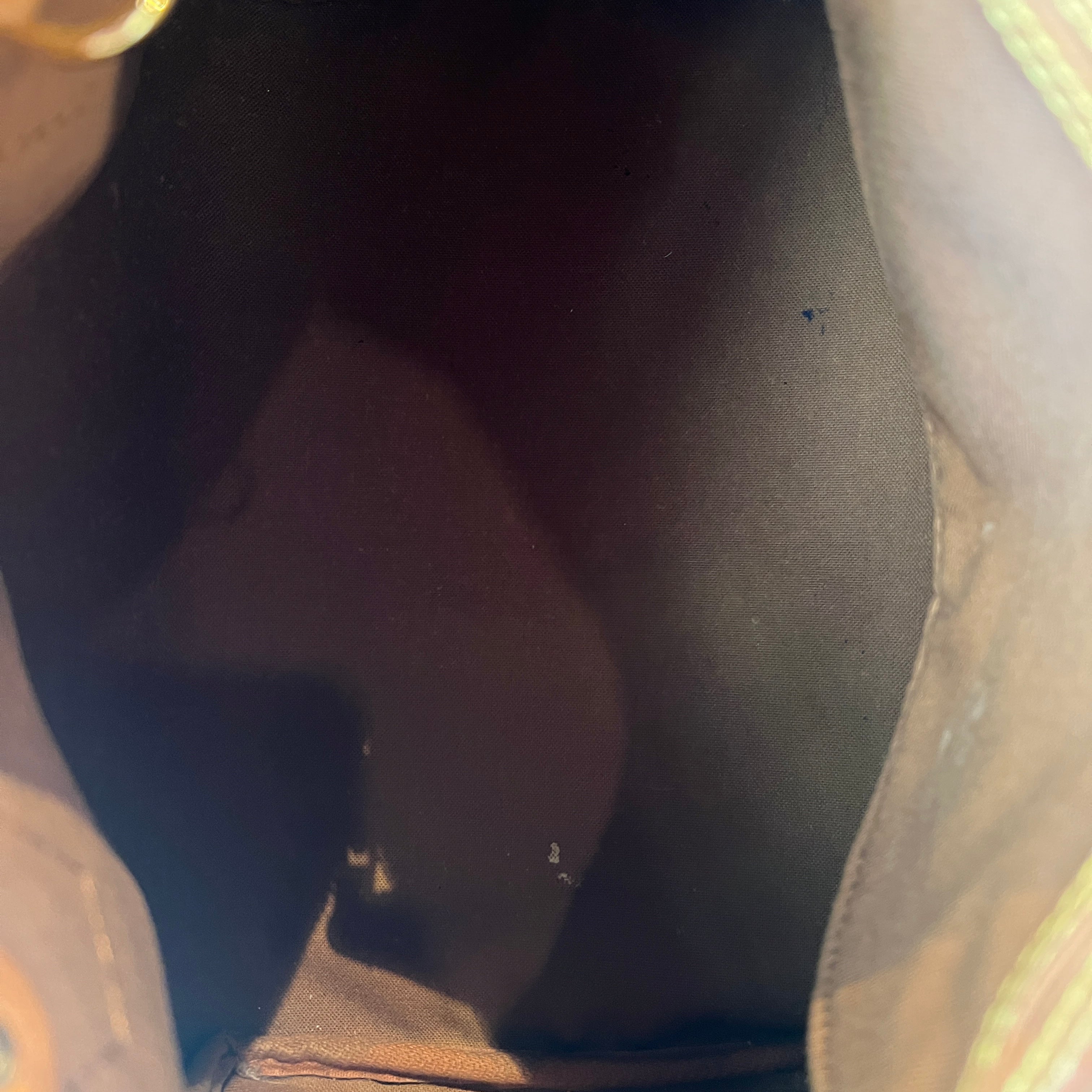 - Handle + Vachetta Leather: The vachetta leather has patinaed displaying wear such as: water spots, scuffing, soiling, rubbing, creasing, scratches while appearing darker in certain areas.