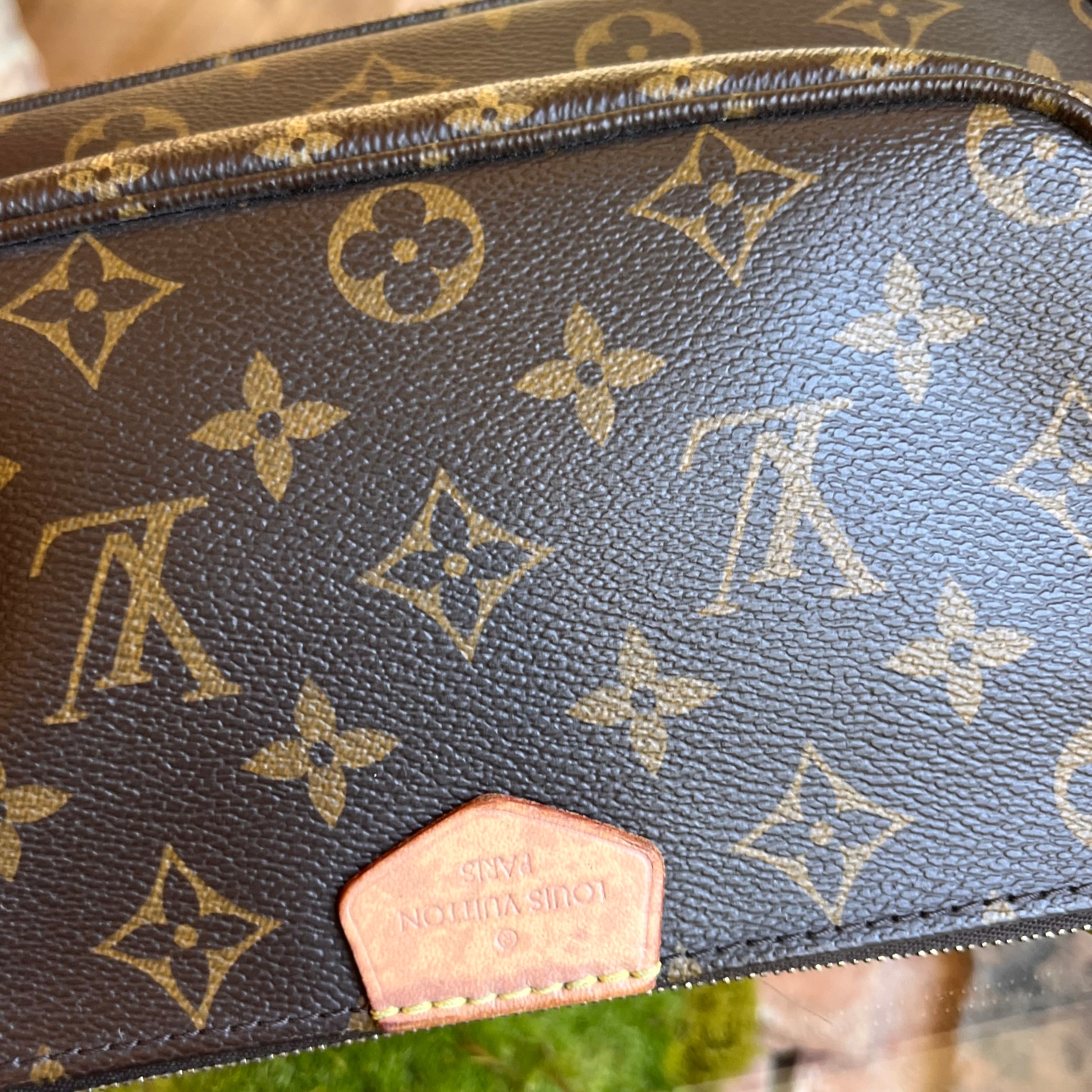 • Handle: The canvas strap is vibrant and unfaded. The vachetta leather tab has developed a medium honey patina with slight soiling.