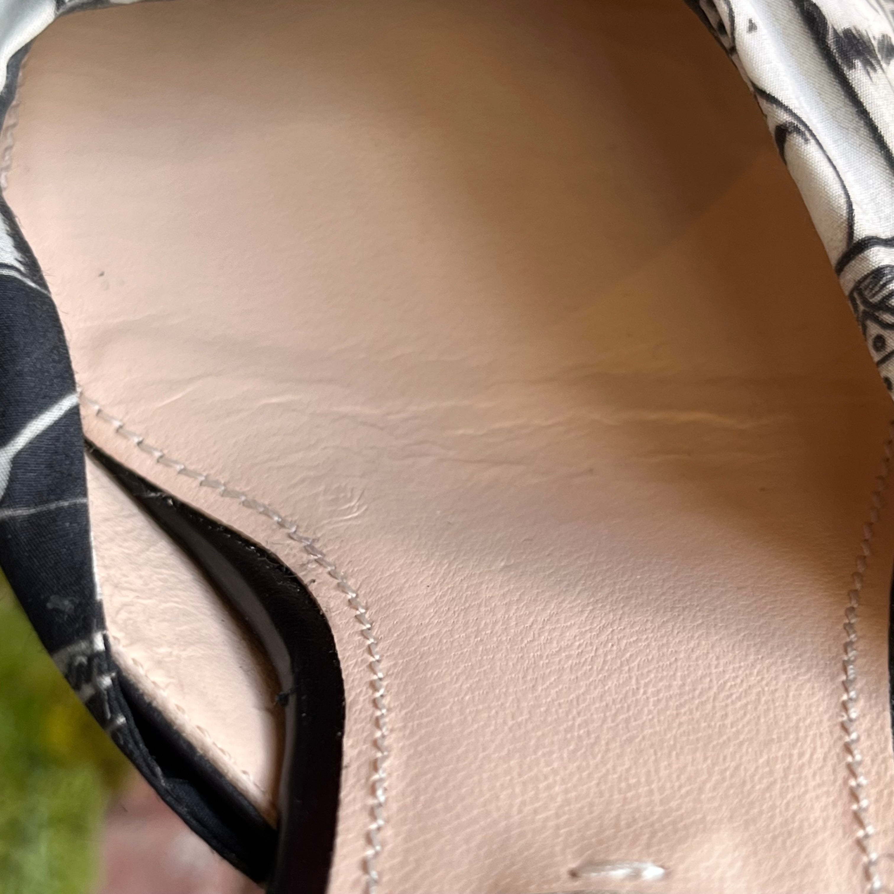 - Exterior: The soles are worn consistently with previous moderate use. The fabric is vibrant and beautiful displaying small imperfections. Overall it's in very good condition.