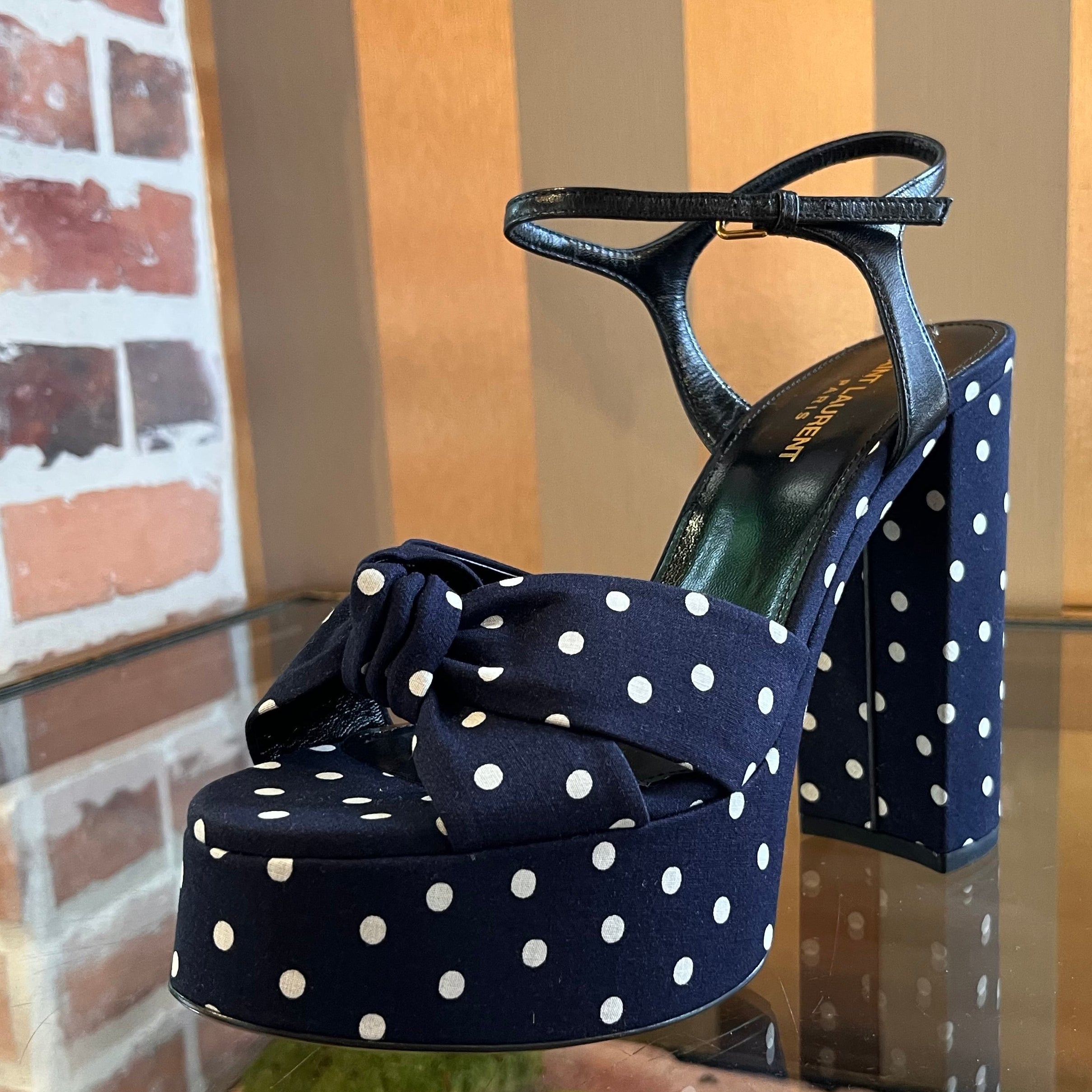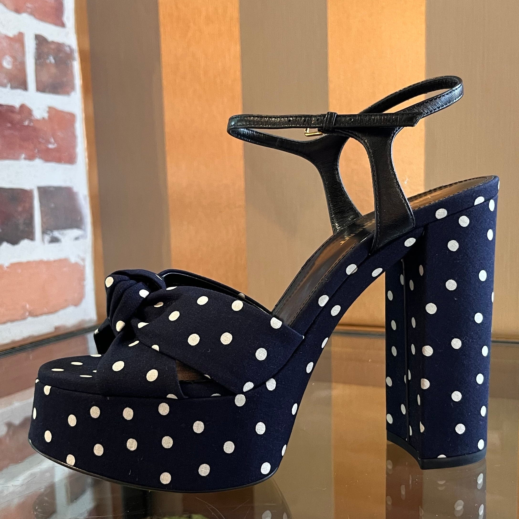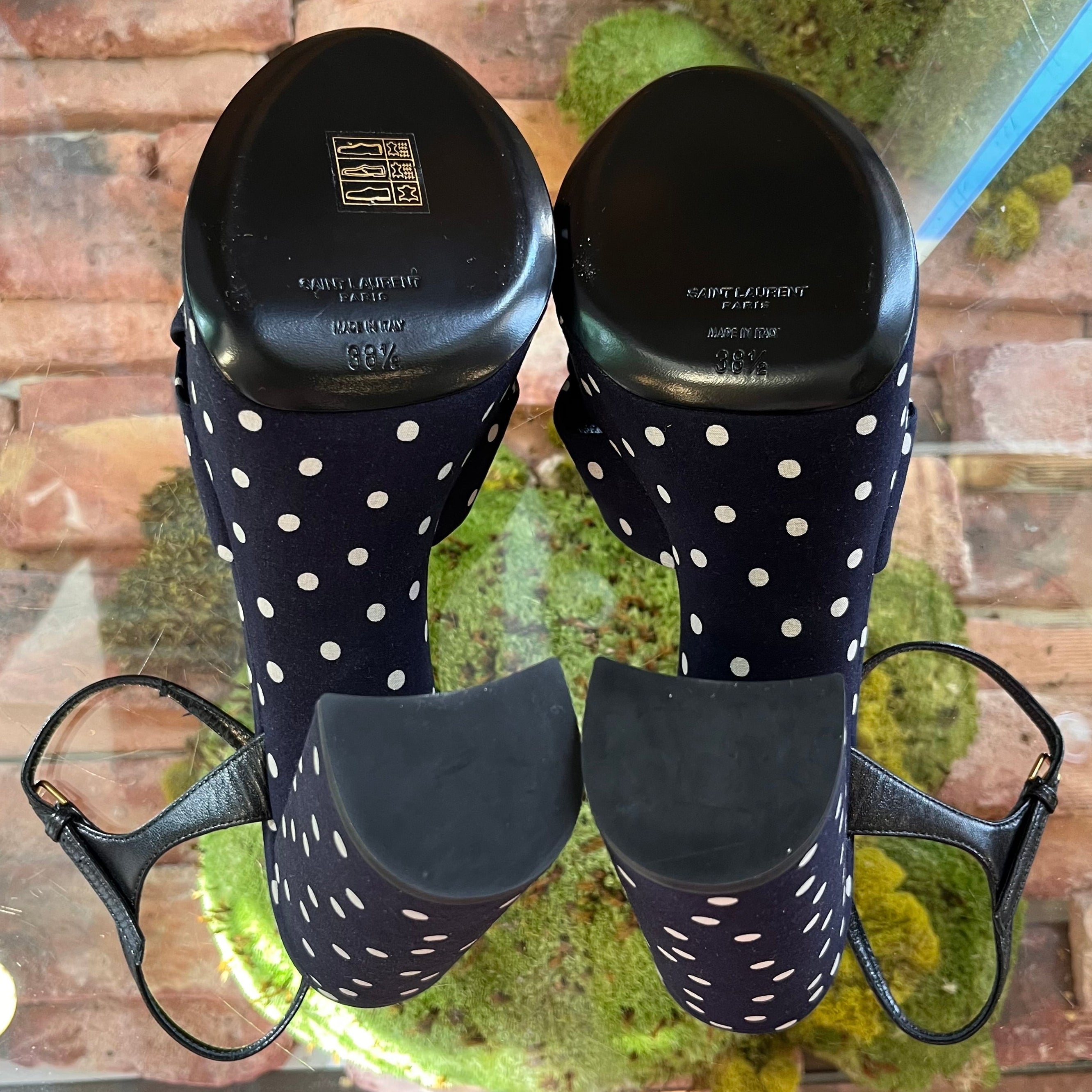 SAINT LAURENT Navy Blue Canvas Polka Dot Bianca Platform Sandals SZ 38 (US 8)
