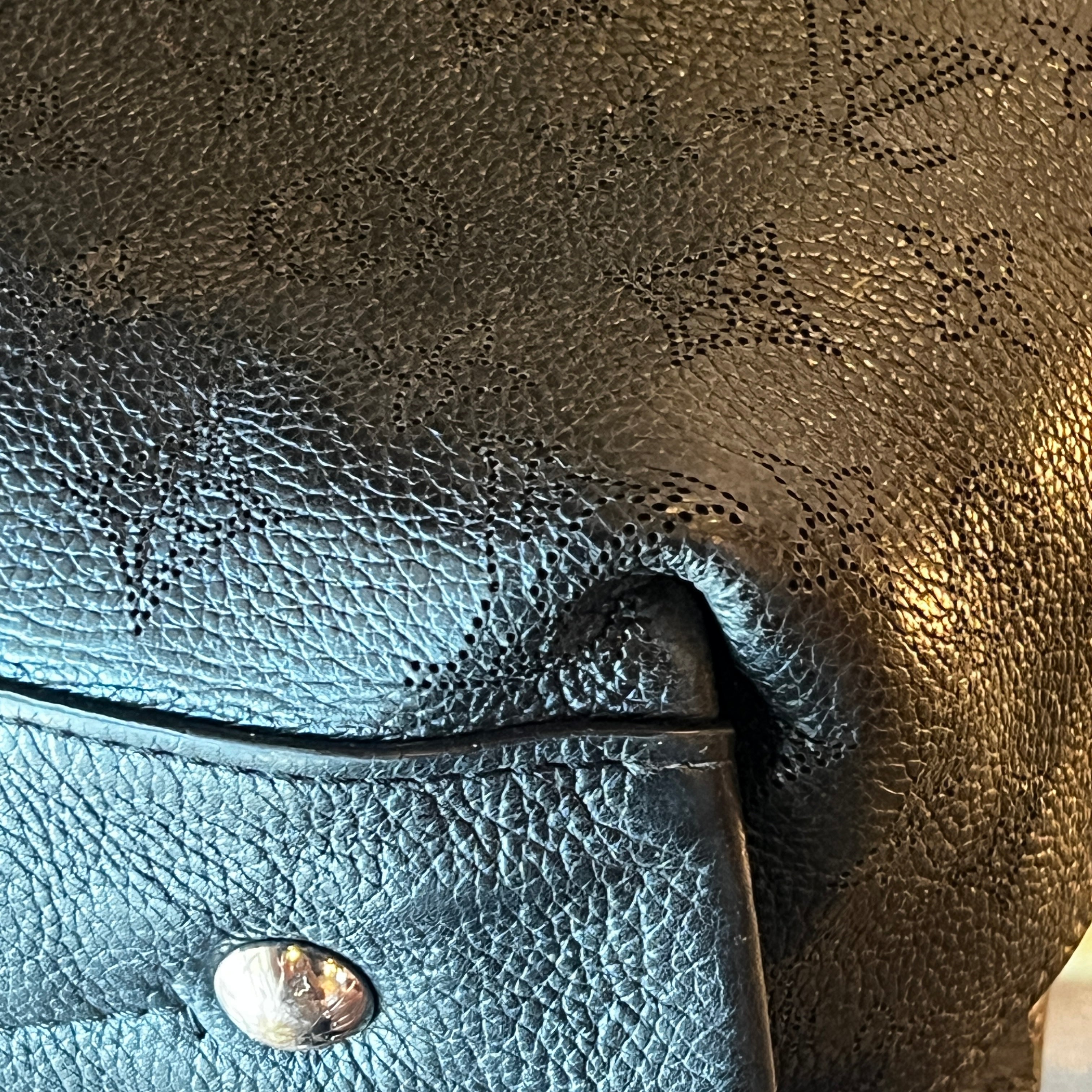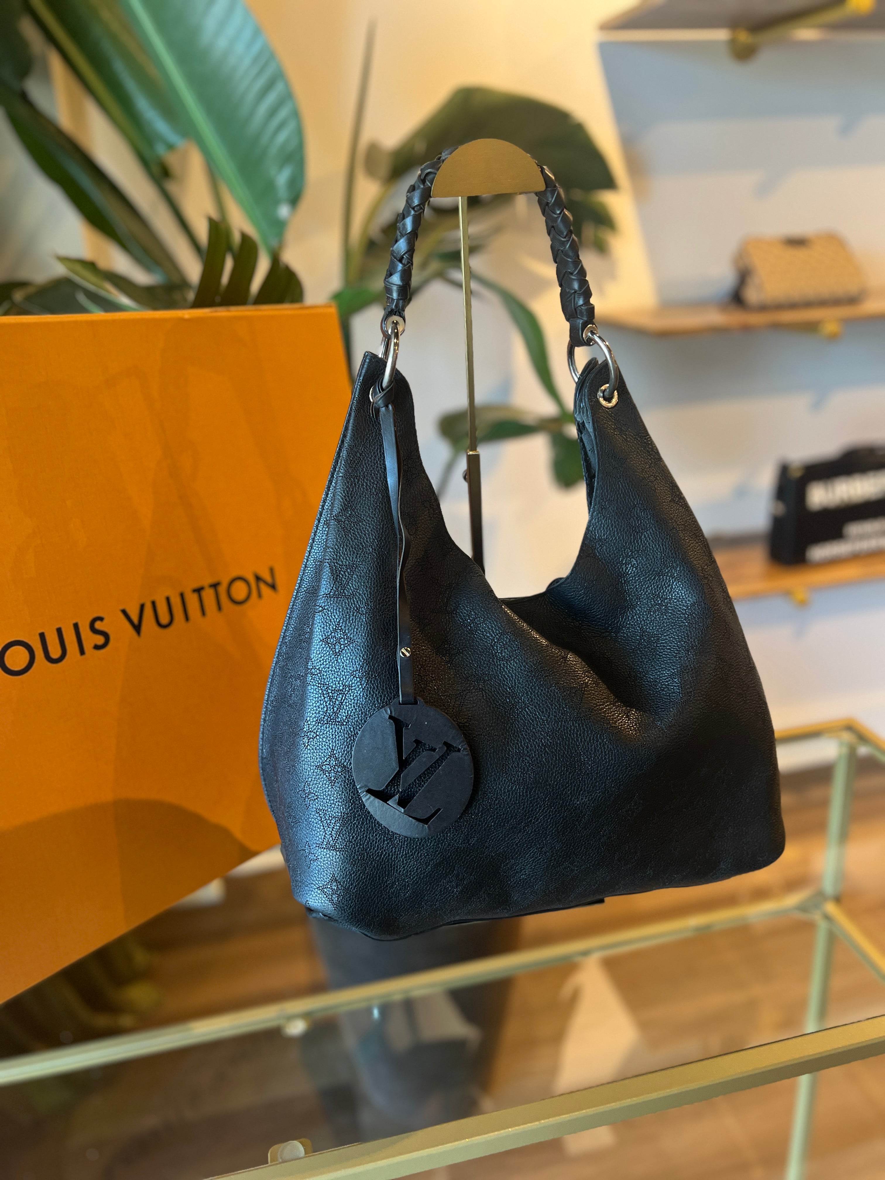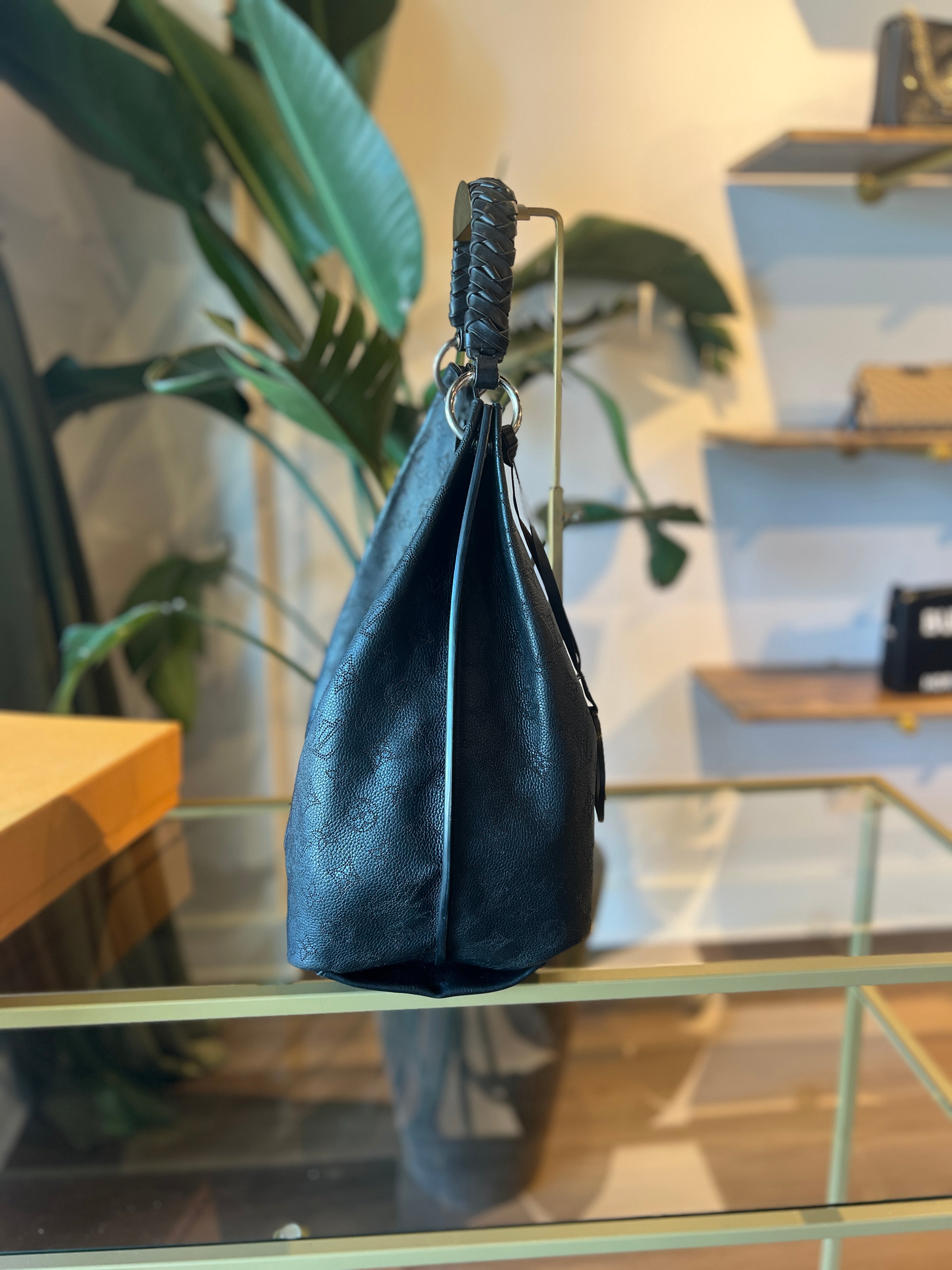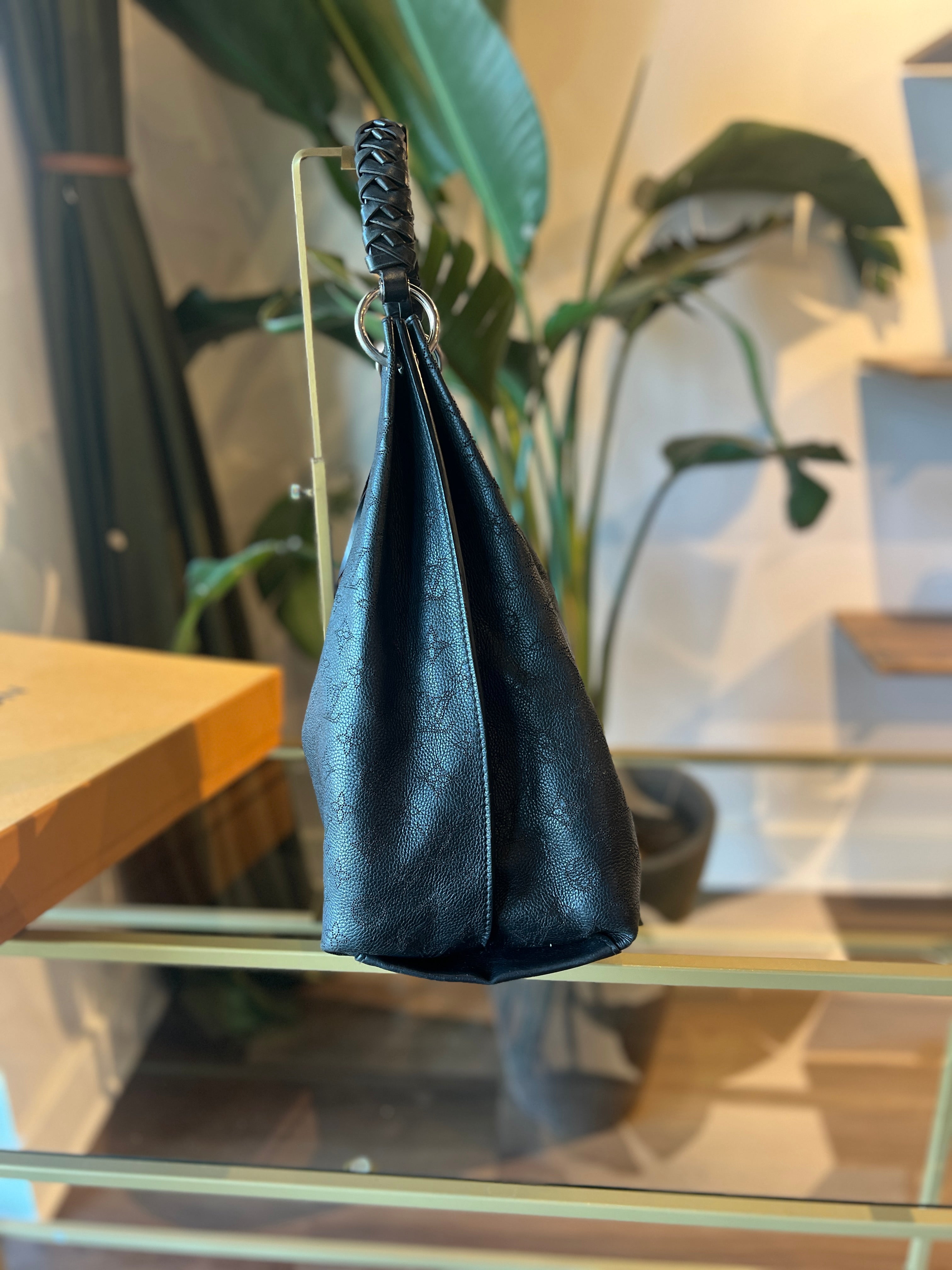 Elevate your ensemble with the LOUIS VUITTON Black Mahina Hobo Shoulder Bag, featuring premium grained leather with signature perforated detailing. Its spacious, curved silhouette offers refined practicality, while the adjustable shoulder strap ensures comfort for all-day wear. This timeless accessory seamlessly blends elegance with everyday functionality, making it a distinguished addition to your collection. Very good condition.