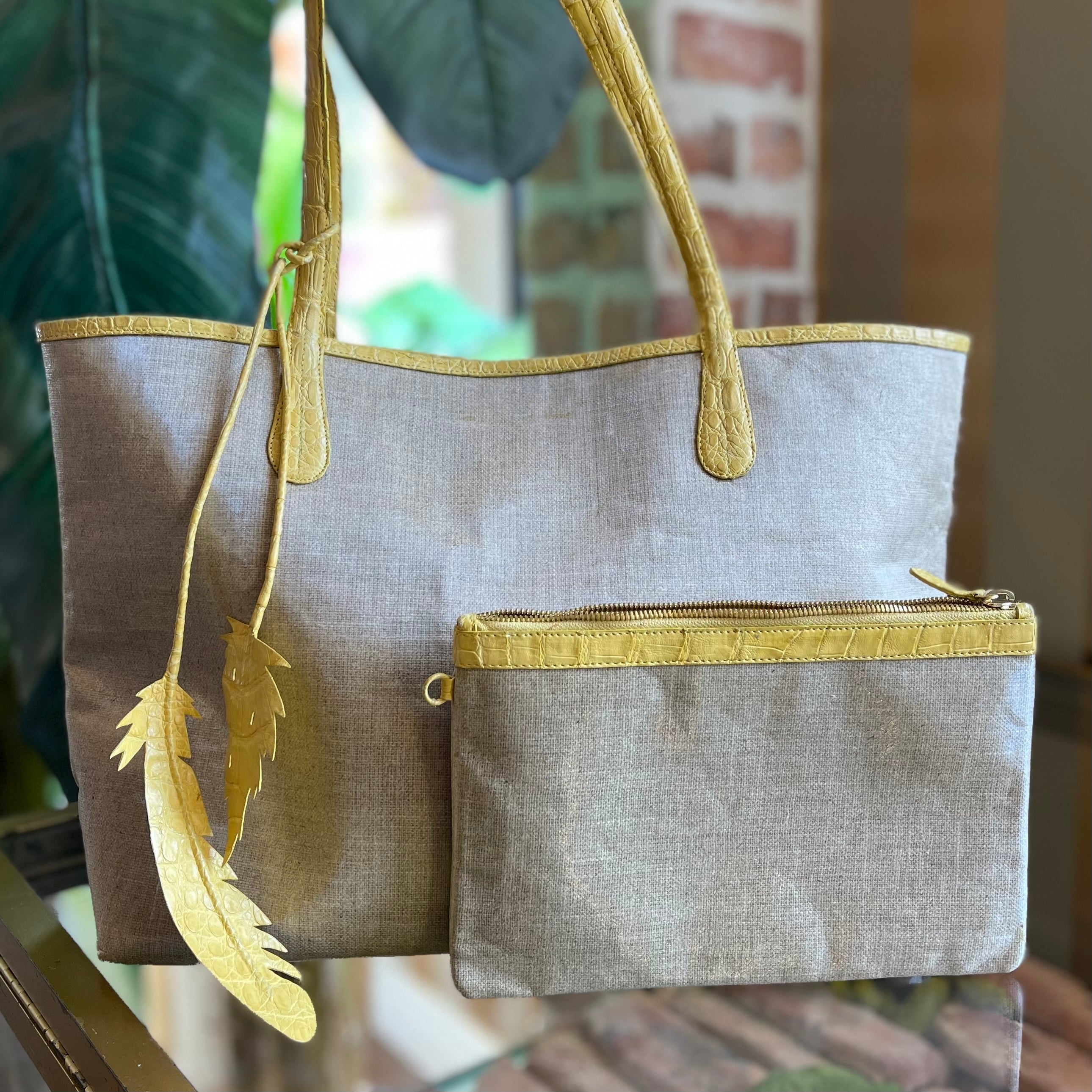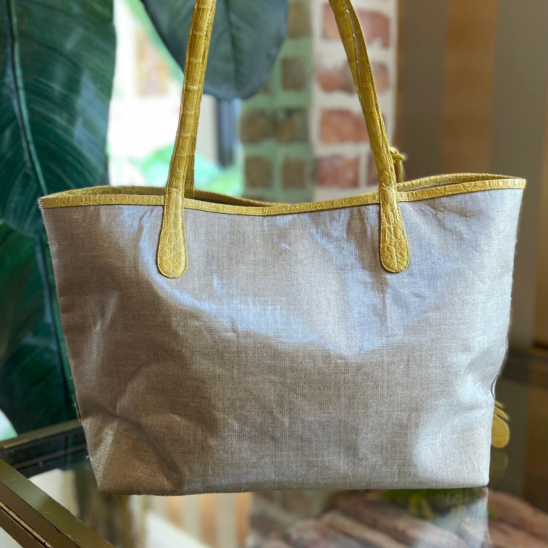 NANCY GONZALEZ Yellow Beige Coated Linen Crocodile Medium Erica Shopper Tote TS3453