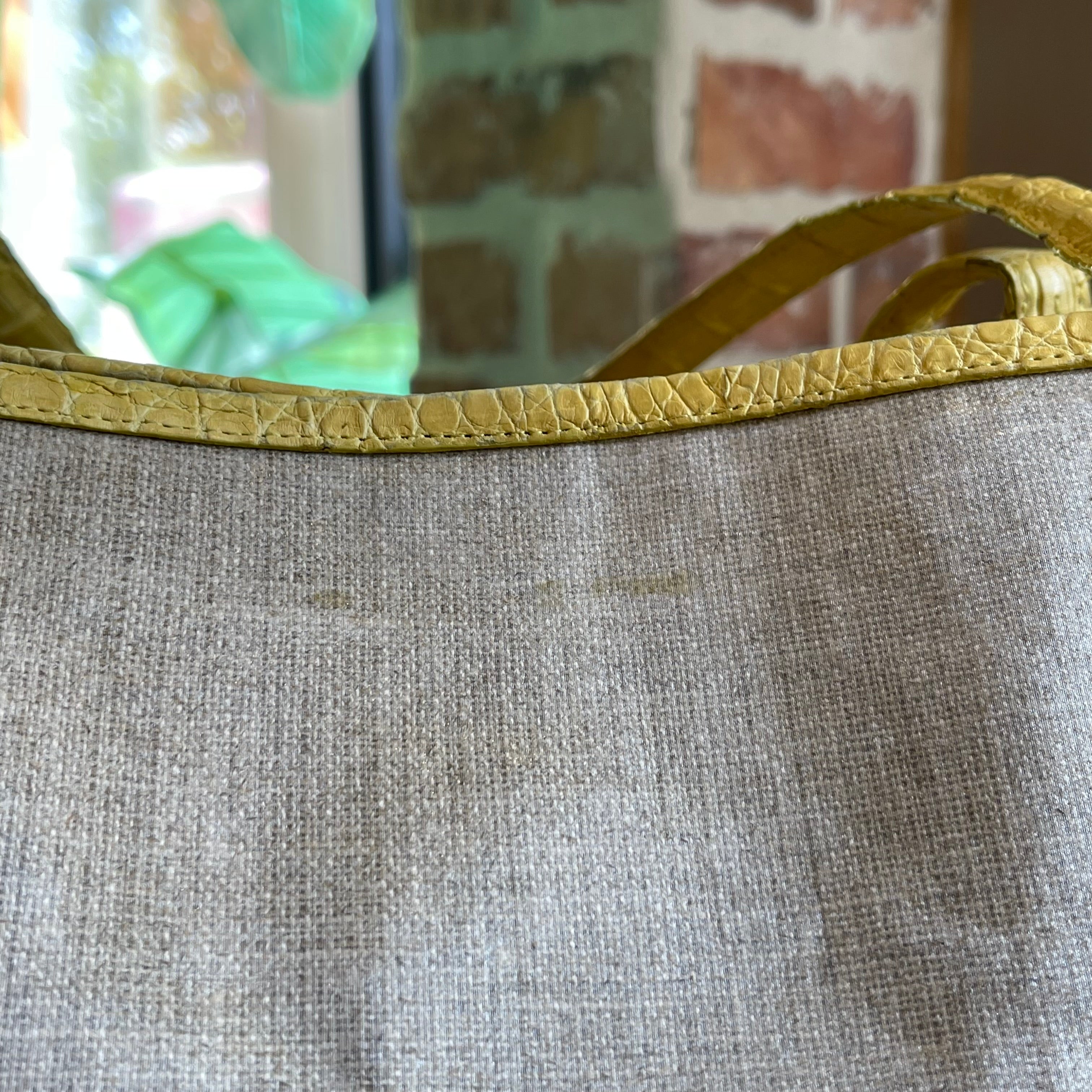 The NANCY GONZALEZ Yellow/Beige Coated Linen Crocodile Medium Erica Shopper Tote is a stylish and functional bag. It features a unique combination of coated linen and exotic crocodile accents, perfect for adding a touch of luxury to your everyday ensemble. It's in very good condition. The corners, along the top, the edge of the straps & the bag charm exhibit moderate rubbing. The pouch has a white mark. Loose thread. Although the coated canvas remains vibrant & unfaded. The interior has a stain which could possibly be cleaned if desired after purchase although it is wearable without overall it's in very good condition.