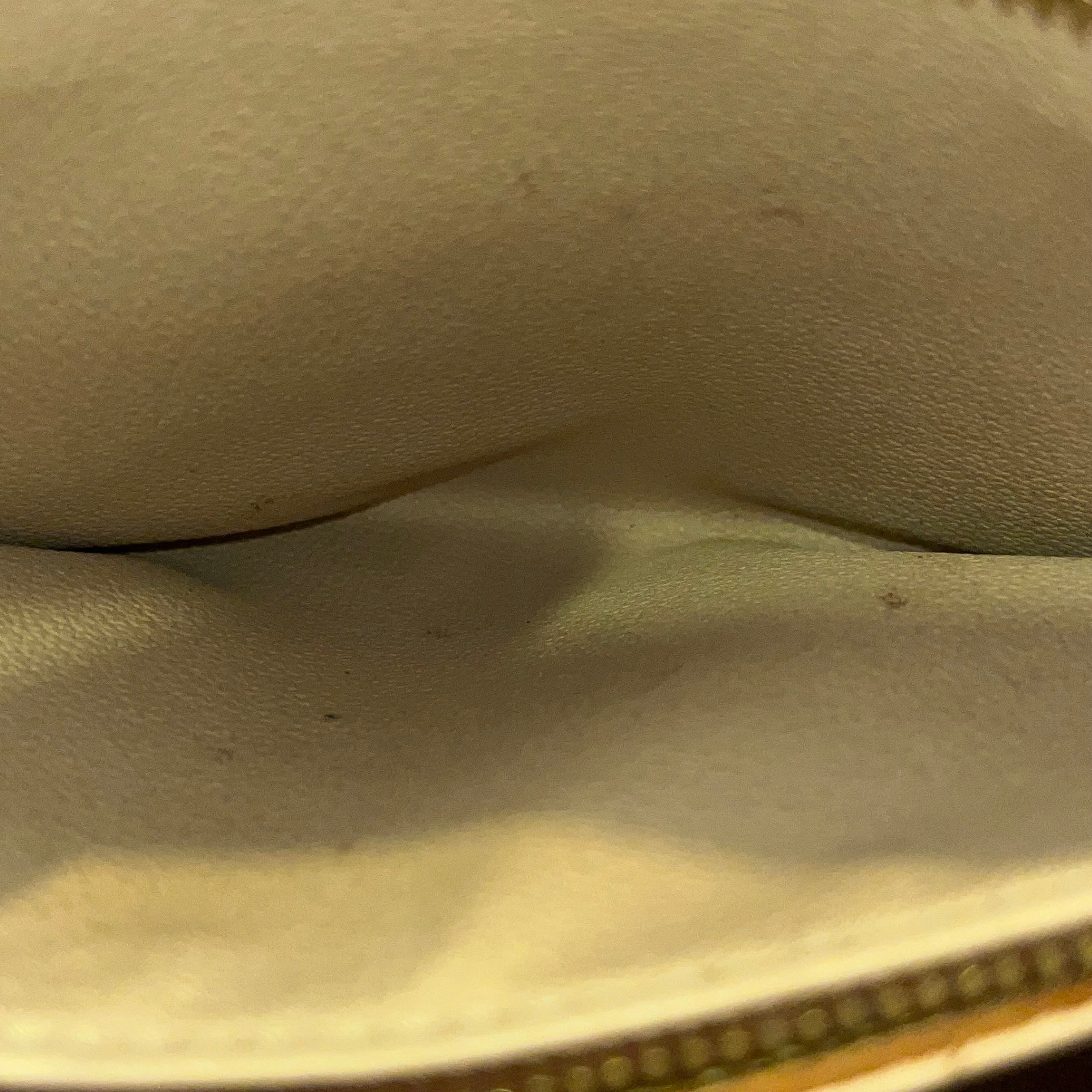 - Handle + Vachetta Leather: The vachetta leather has heavy wear with a moderate patiana displaying wear such as: water spots, scuffing, soiling, rubbing, markings, dryness, general surface wear, creasing, softening, scratches while appearing darker in certain areas(please refer to photos).