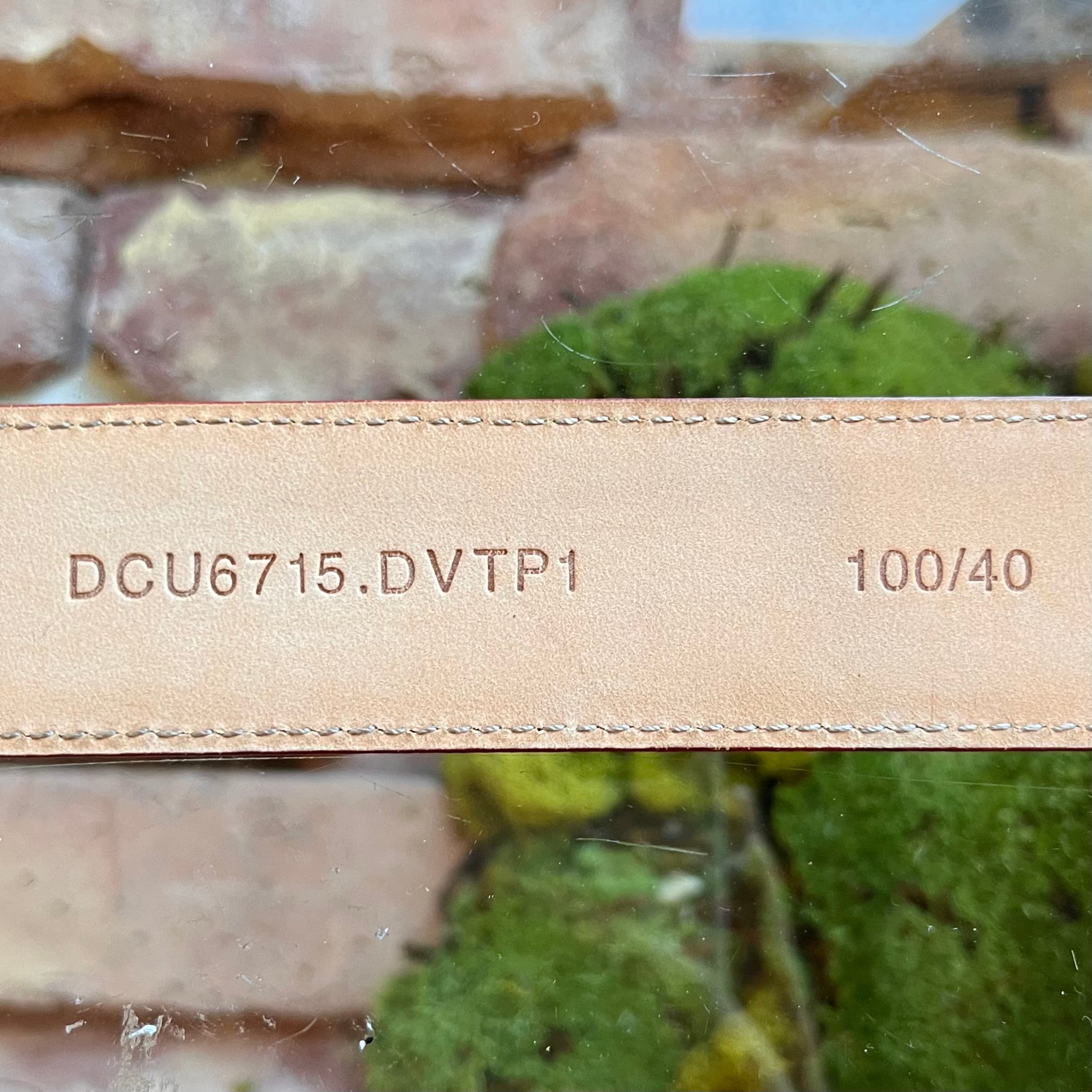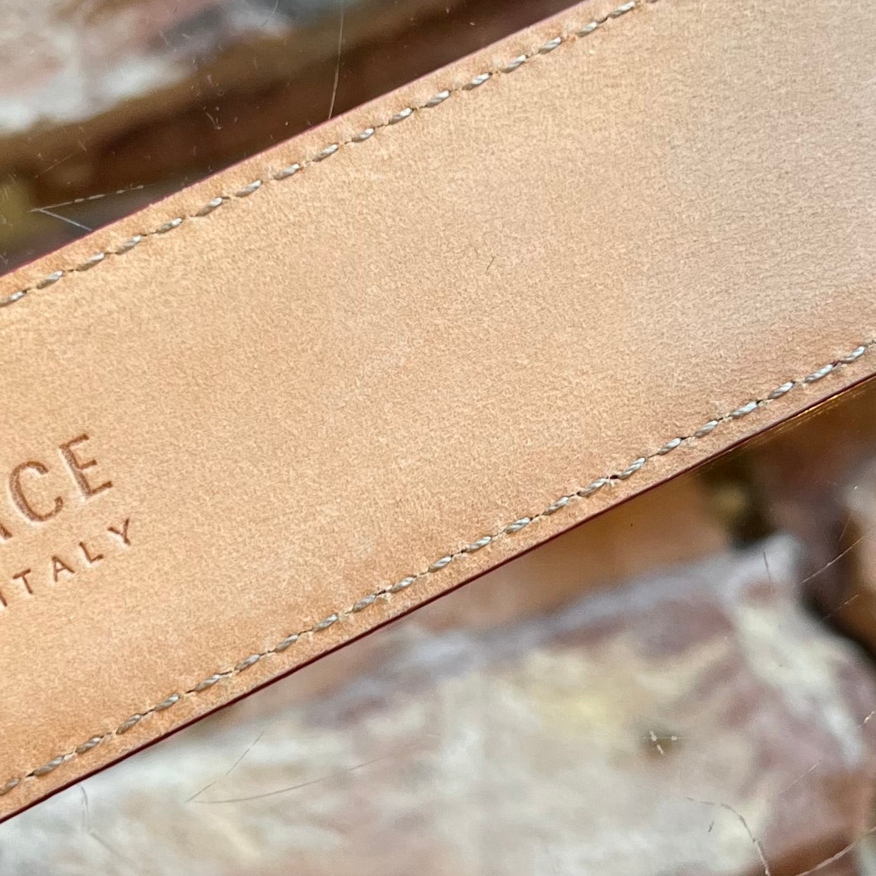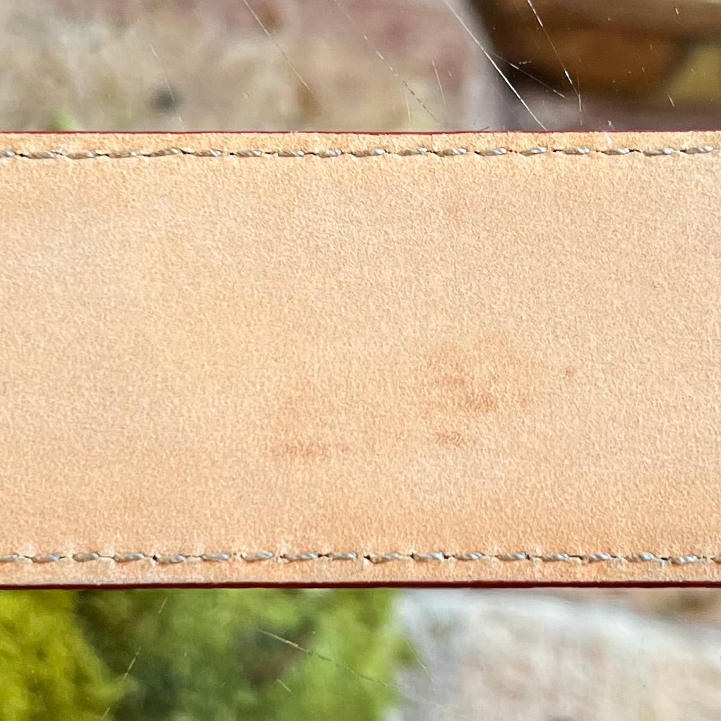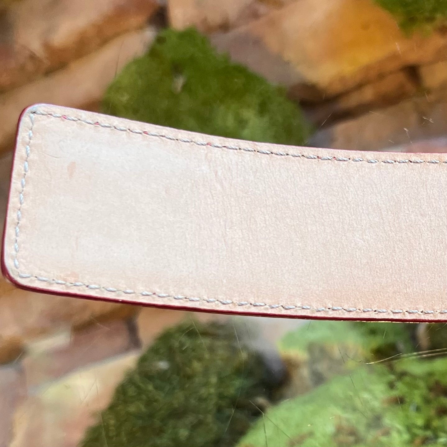 - Exterior: Gentle creasing near the holes. Inner side of belt show gentle hairline scratches. Adhesive residue on back of belt buckle. Leather is smooth and supple. Color is clear and vibrant. Overall very good condition.