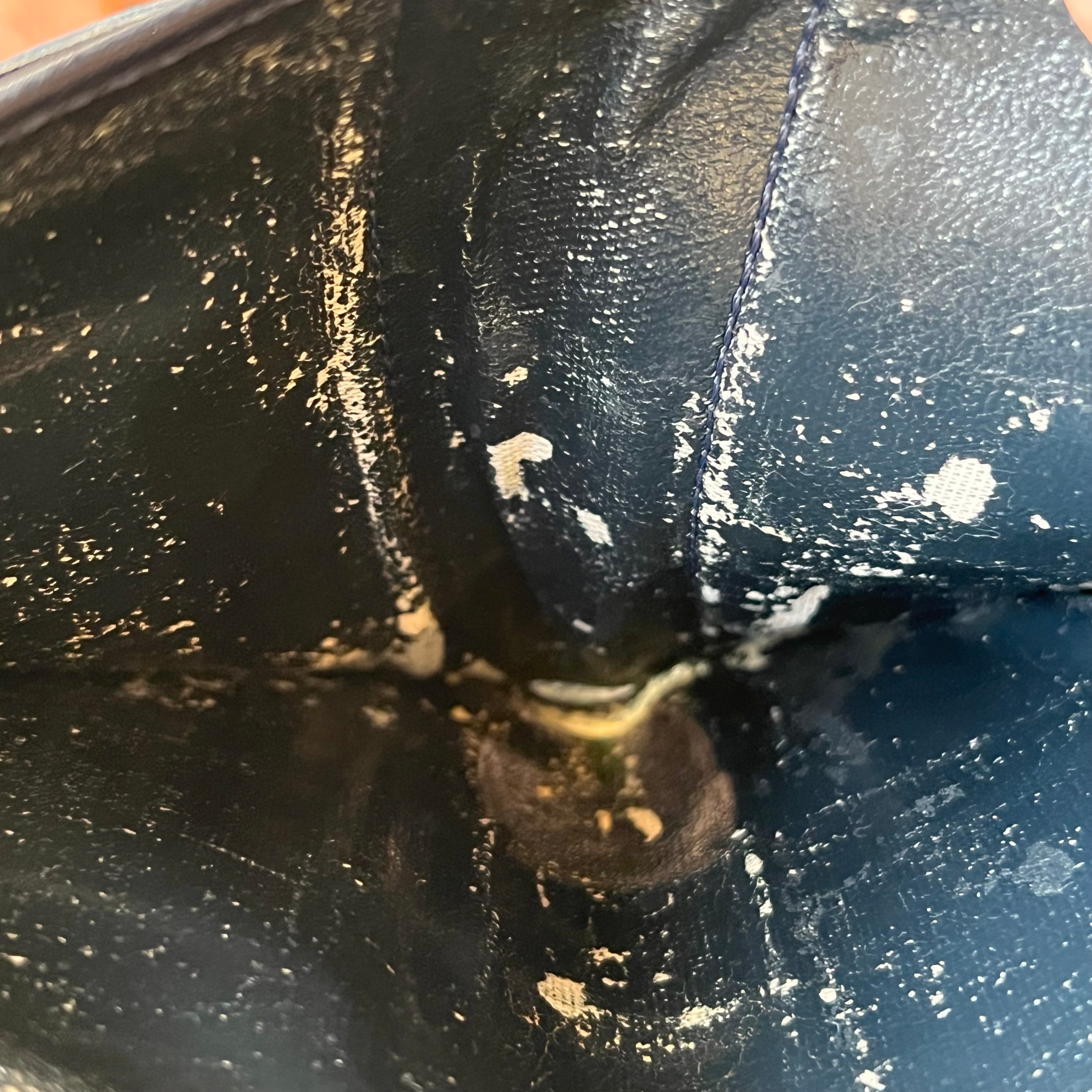 - Interior: Please note that due to the natural aging process, the interior lining exhibits deterioration—though it remains intact, not powdery or flaky to the touch. While the lining is fully usable as-is, some collectors may choose to have it professionally relined for longevity. This does not affect the bag’s structural integrity. Scratches, rubbing, marks.