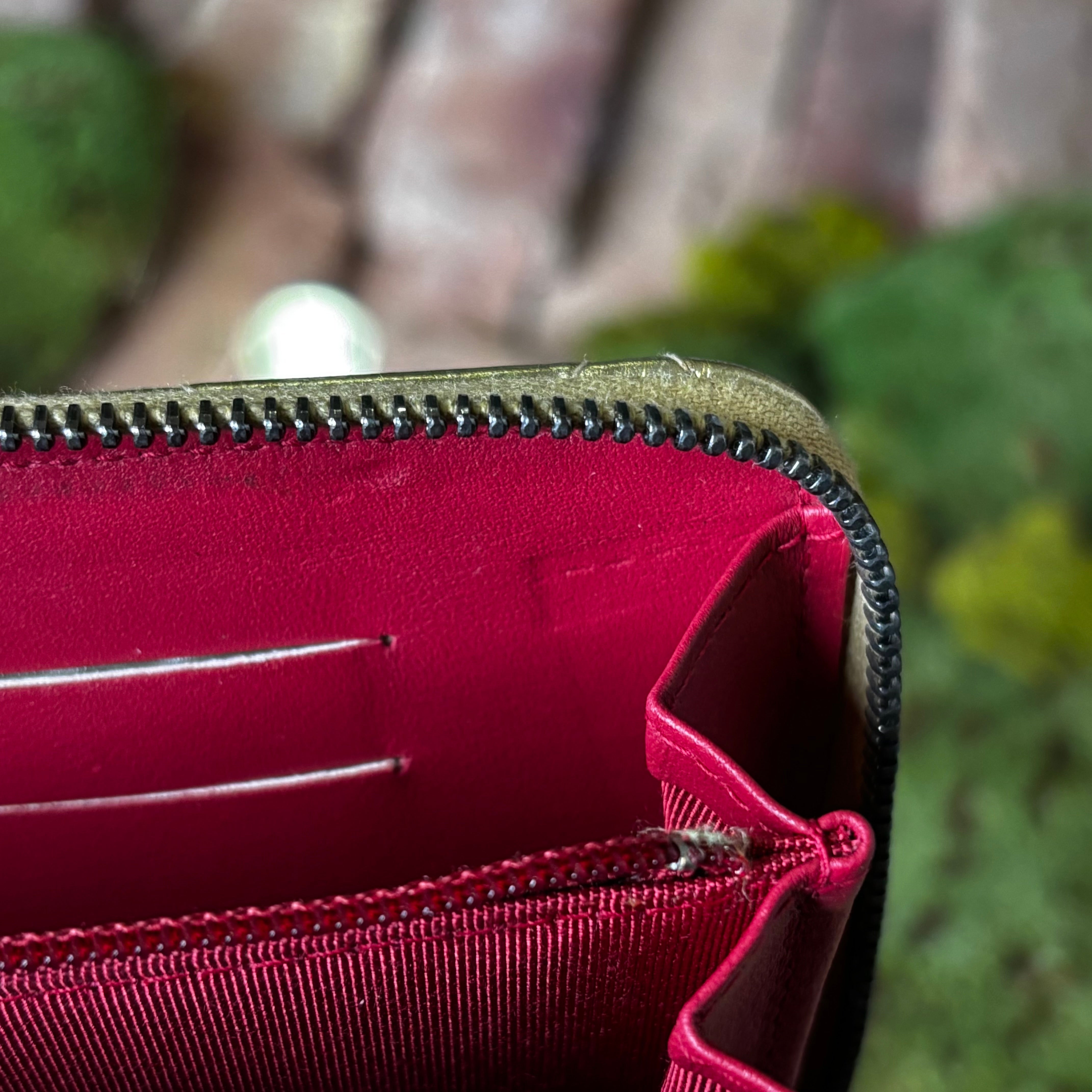 - Exterior: The leather is rich and supple with general wear along the zipper pull, gentle rubbing and gentle scratches. Overall it's in very good condition.
