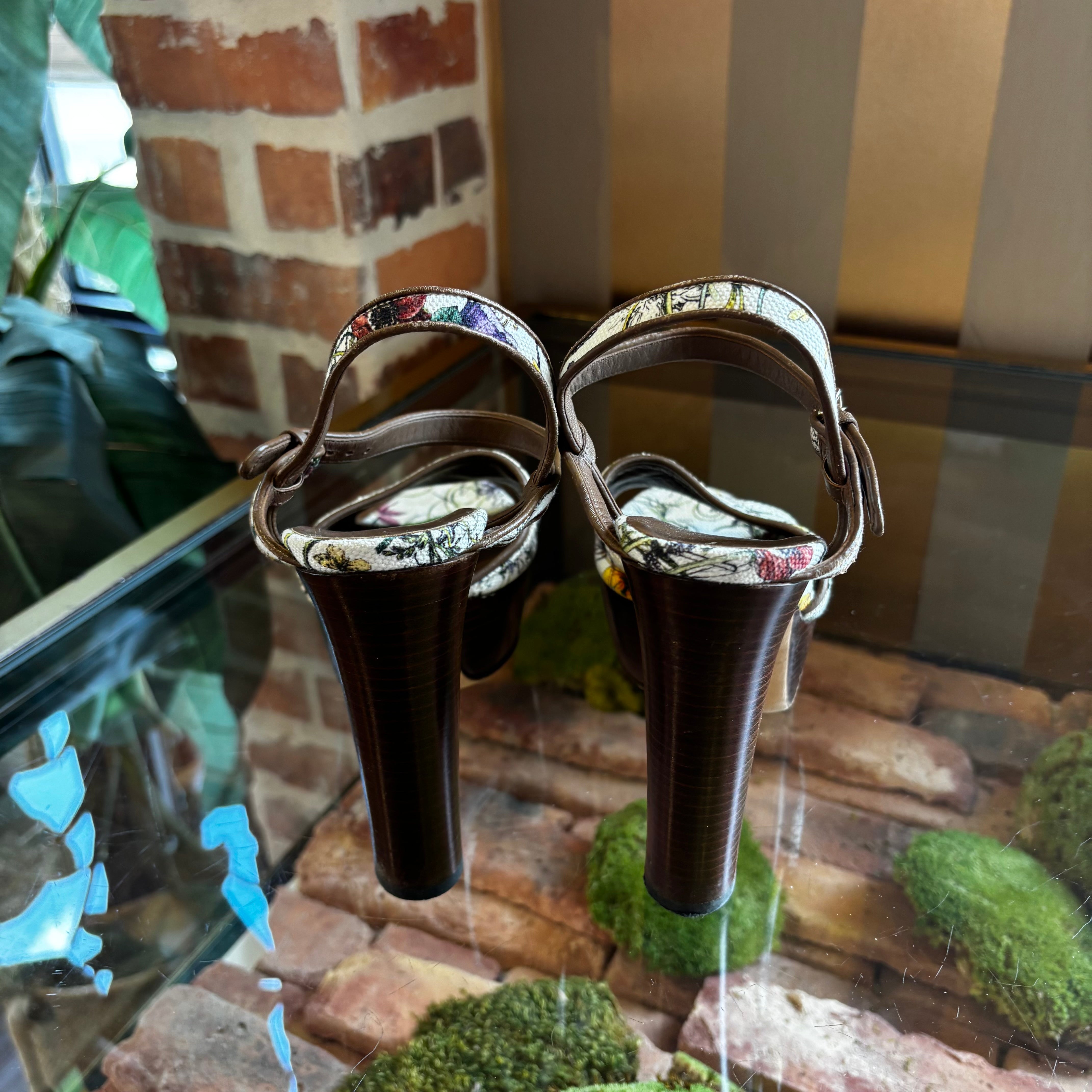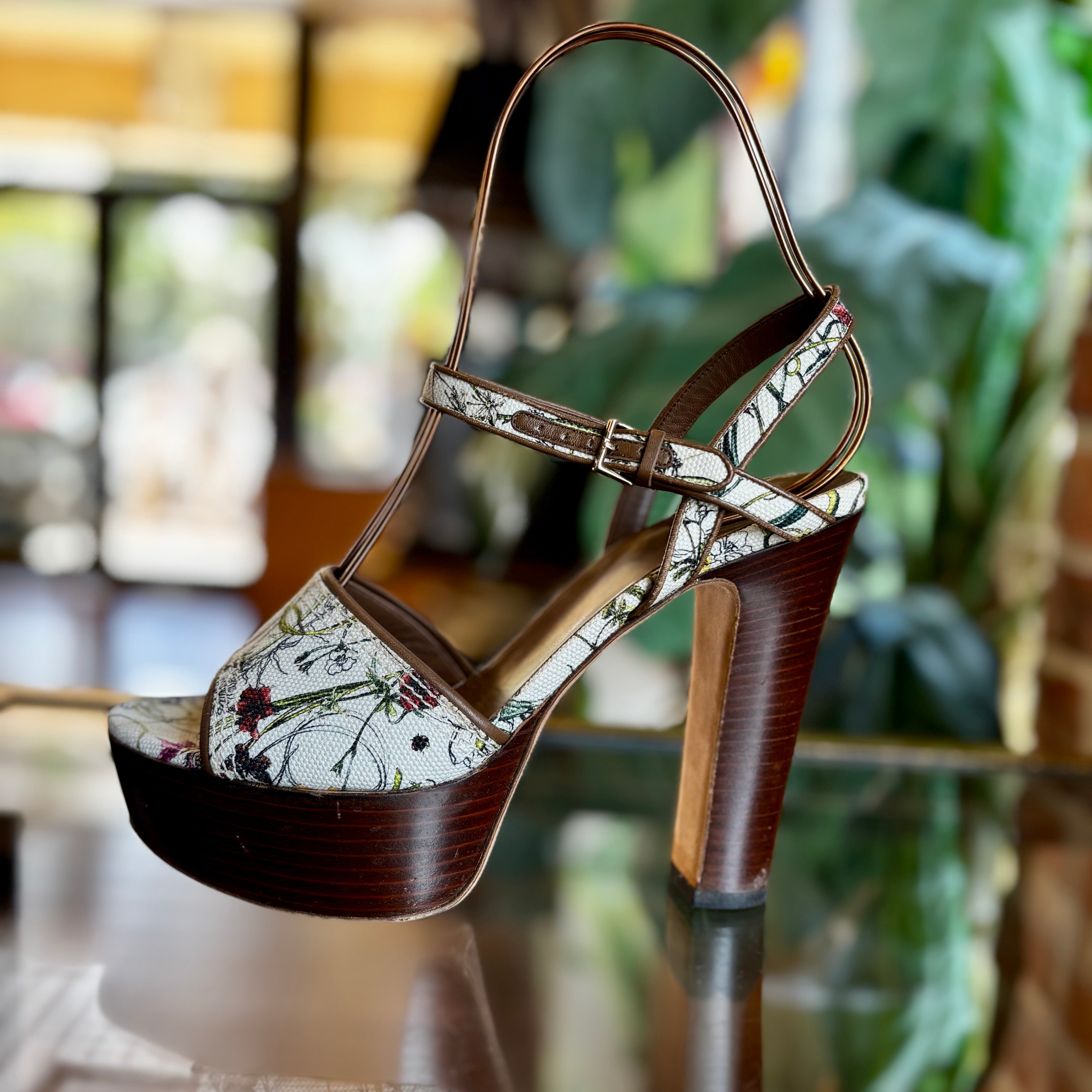 - Design: Open-toe platform heels featuring Gucci’s iconic Flora print
